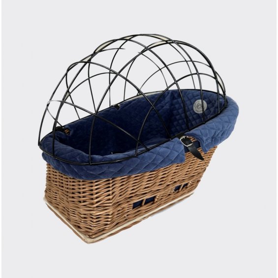 Very stylish and functional bicycle basket for transporting animals mounted on the trunk. Equipped with a solid mounting bracket, safety grille, a cover and a soft cushion. The cover with a cushion ensures the comfort of traveling. For greater safety, a short leash with a carabiner has been attached inside, to which you can attach a dog's collar. The mounting bracket is adjustable, thanks to which the basket fits into any trunk. Its knob allows for quick assembly and disassembly of the basket. Grille mounted with three leather straps. You can easily dismantle it at any time and transport your pet fastened with a leash. The basket is designed for animals up to 15 kg.