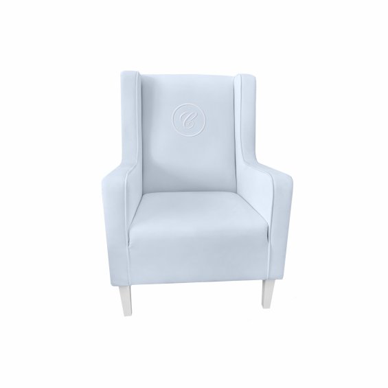 A large, very comfortable modern style armchair, 'eared' type, made of high-quality washable textile in light blue colour. The armchair is decorated with grey corded trim and exclusive emblem with 'C' letter. Our feeding armchair will be appreciated by every nursing mother, because of its 'ears' and a high back. Moreover, it will enrich every interior- child room, living room and others.