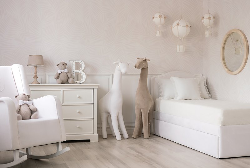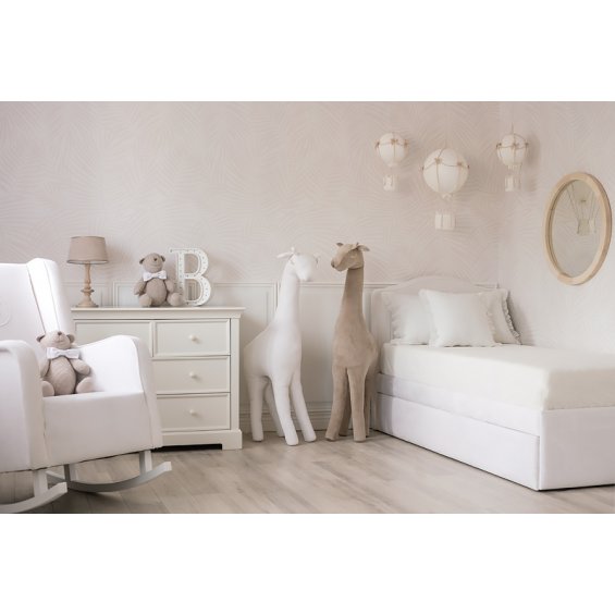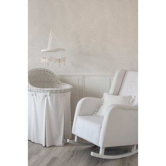 A large, very comfortable modern style rocking armchair, 'eared' type, made of high-quality washable textile in ivory colour. The armchair is decorated with grey corded trim and exclusive emblem with 'C' letter. Our feeding armchair will be appreciated by every nursing mother, because of its 'ears' and a high back. Moreover, it will enrich every interior- child room, living room and others.