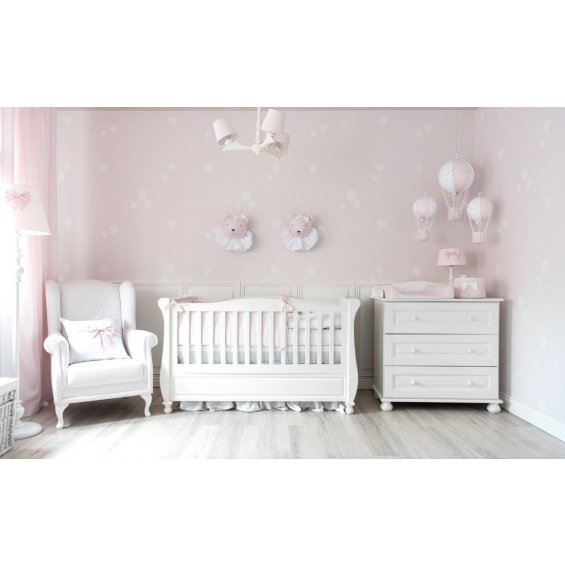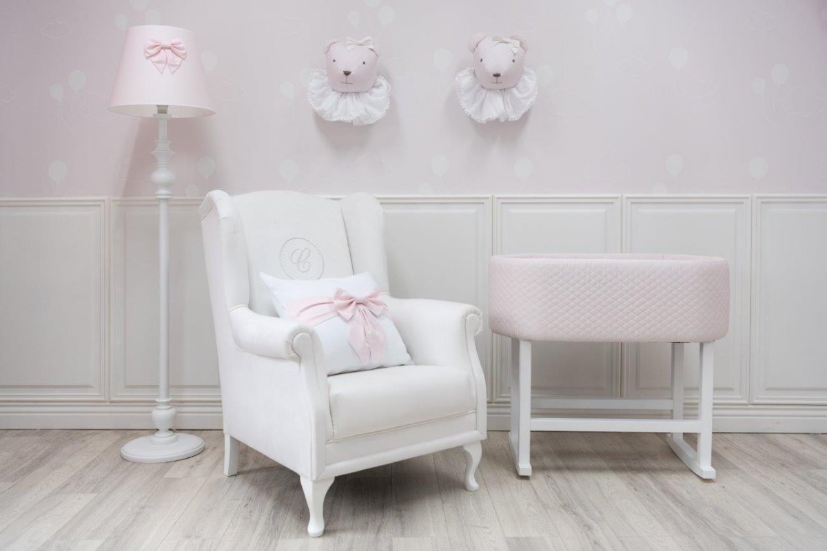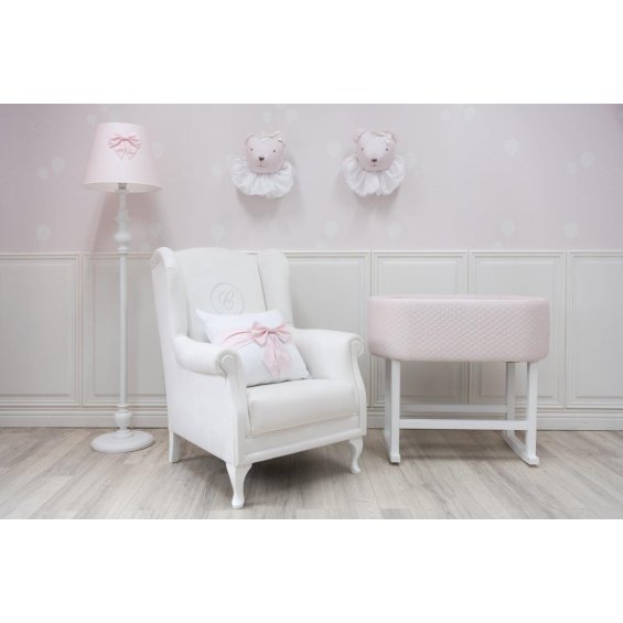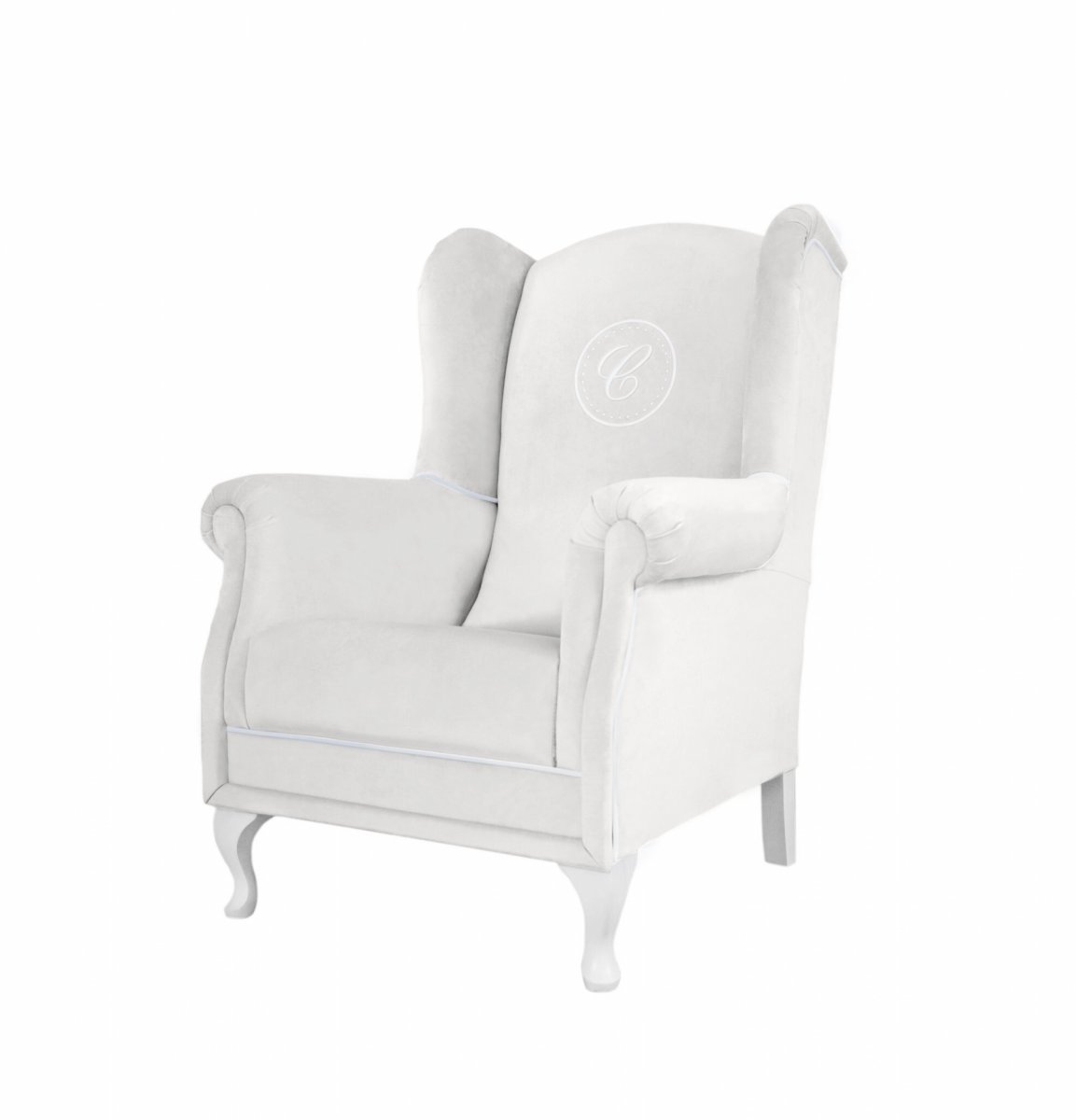 A large, very comfortable armchair, 'eared' type, made of high-quality washable textile in white colour. The armchair is decorated with grey corded trim and exclusive emblem with 'C' letter. Our feeding armchair will be appreciated by every nursing mother, because of its 'ears' and a high back. Moreover, it will enrich every interior- child room, living room and others.