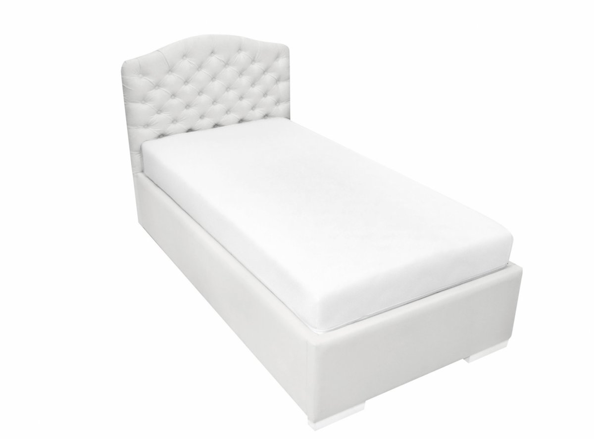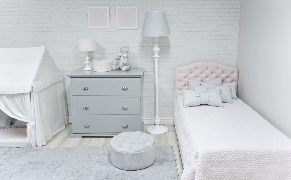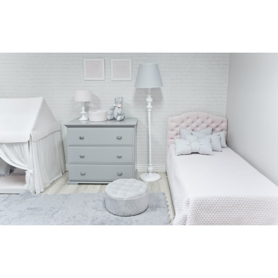 Elegant child bed with exclusive quilted back head. Bedhead and frame are upholstered with high-quality washable textile in ivory colour what makes the furniture even more functional. You can order a bed with a box storage, which lets you storage a bedding inside the bed. Box is a part of the bed.