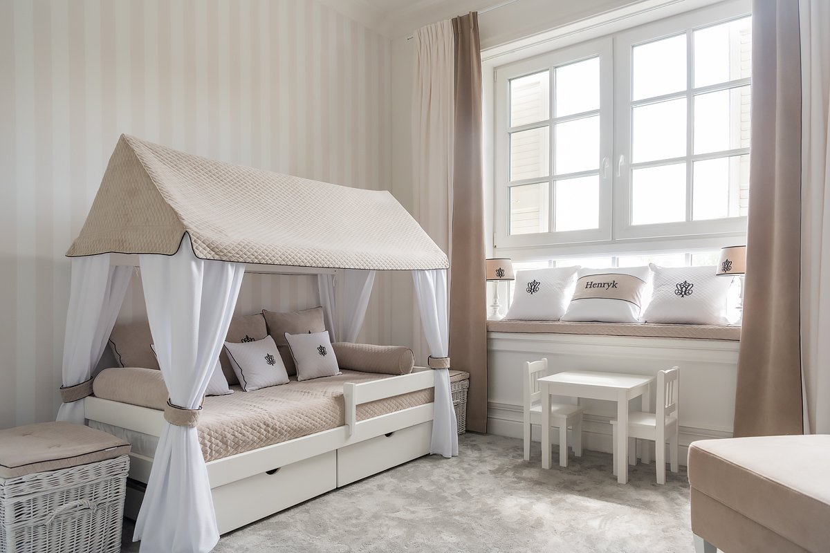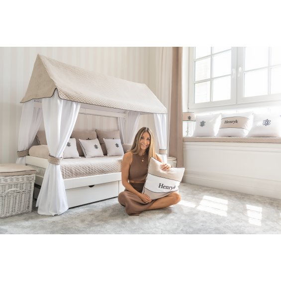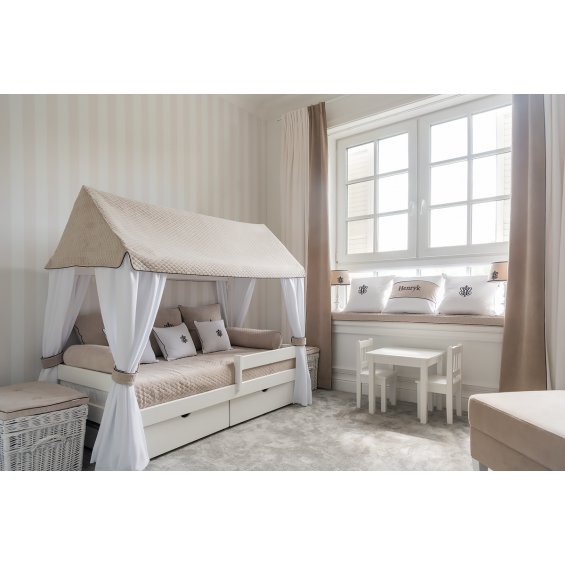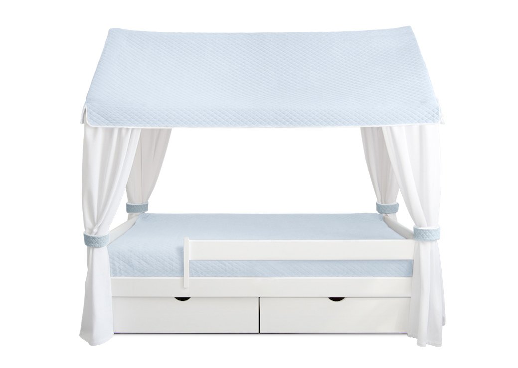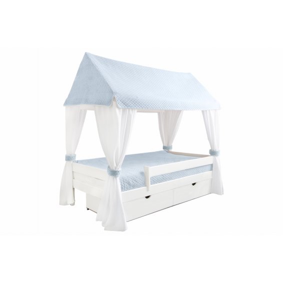 A wonderful house-shaped bed, perfect for little boys. The bed will create a unique atmosphere in your son's room. The canopy is made of blue quilted velour, and the 'walls' are made of a white waffle fabric decorated with bands