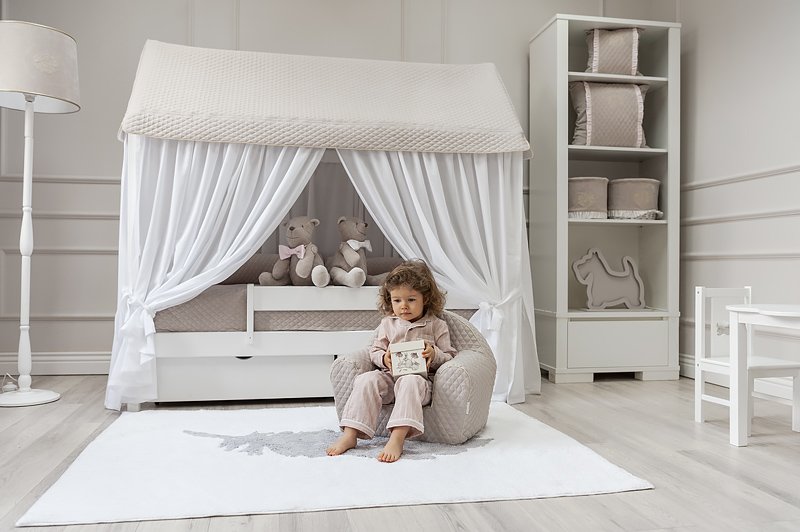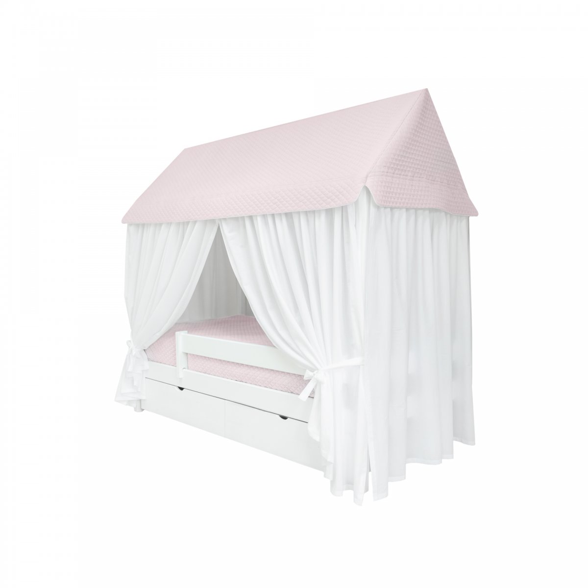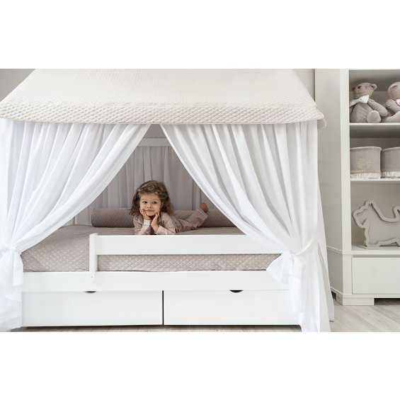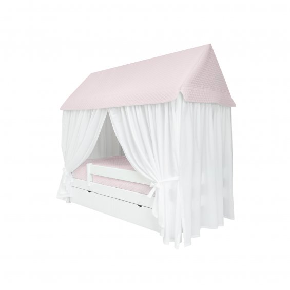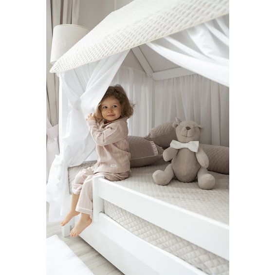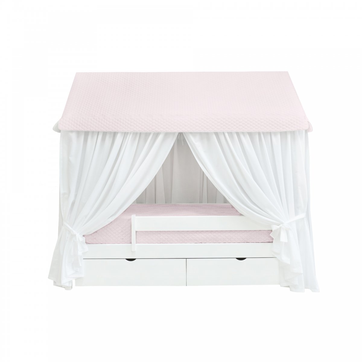A wonderful house-shaped bed, perfect for little girls. The bed will create a unique, fairy-tale atmosphere in your daughter's room. The canopy is made of pink quilted cotton material, and the 'walls' are made of a delicate, white textile, decorated with two charming bows.