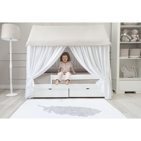 NOTES: the bed is made of wood that dries and works during use. On the surface, the texture of the wood is visible, as well as grains and knots that can change color. The product consists of a bed frame with drawers, canopy and curtains. The price does not include a mattress or a cover, these products can be extra purchased. The product requires self-assembly according to the instructions included in the package