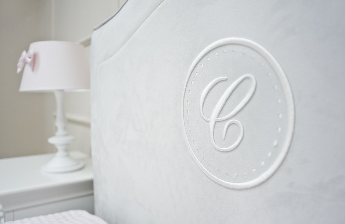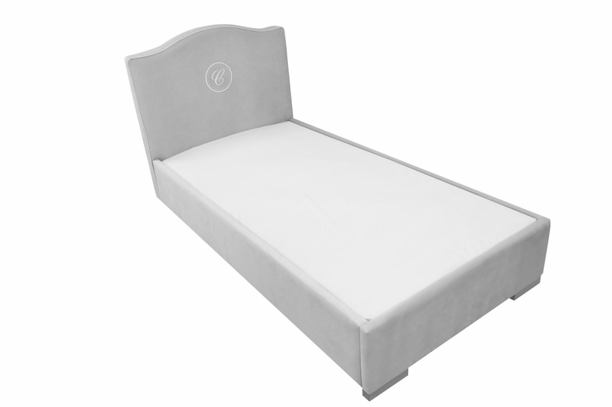 Elegant child bed with exclusive embroidery with 'C' letter. Bedhead and frame are upholstered with high-quality washable textile in grey colour what makes the furniture even more functional. The bedhead is finished with decorative wave and white inset. The bed has a drawer for a second mattress allowing an additional person to sleep. It can be also used for store bedding. You can order a bed in different sizes.