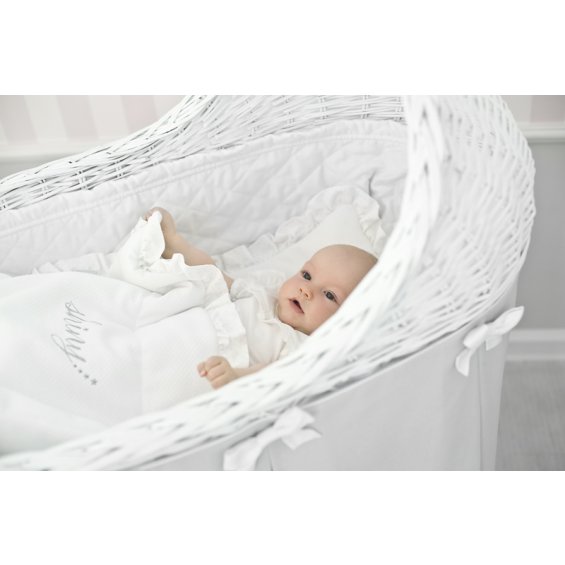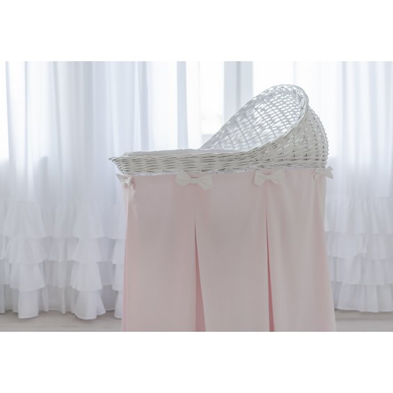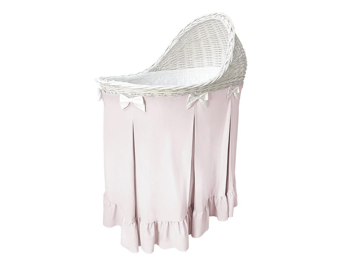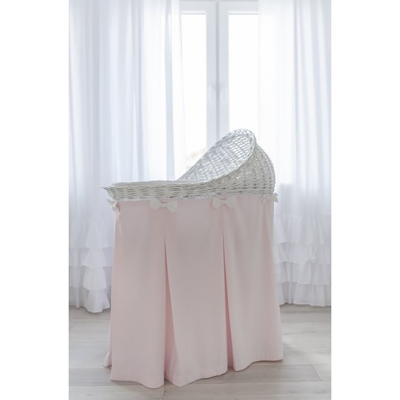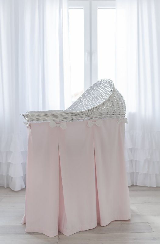 A very glam bassinet for a newborn, made from natural hand-woven Polish wicker in white colour. It's equipped with functional chassis with wheels. The original alternative for the traditional crib in first months of child's life. A frame of the crib is trimmed with a beautiful velvet skirt in light pink colour. The skirt is decorated with pleats, flounce and velcro bows, which create a very subtle and aesthetic composition. The inside of the crib is lined with soft velour that protects a baby from injuries. There is an oval mattress at the bottom of the bassinet.