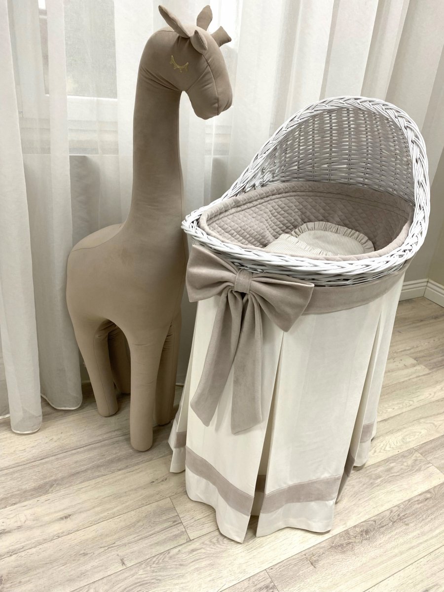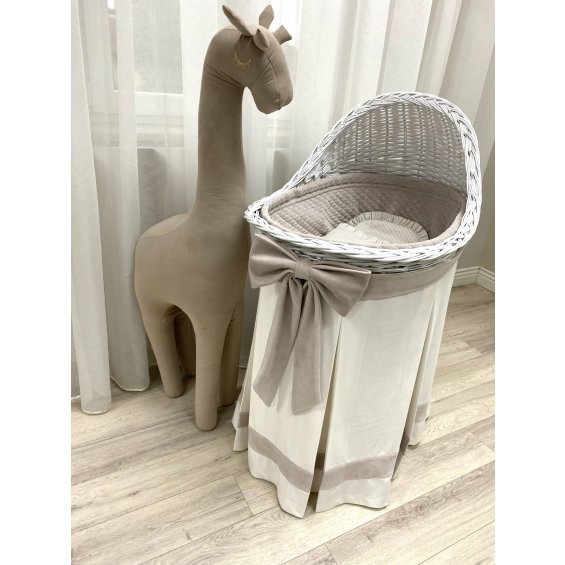 A very glam bassinet for a newborn, made from natural hand-woven Polish wicker in white colour. It's equipped with functional chassis with wheels. The original alternative for the traditional crib in first months of child's life. A frame of the crib is trimmed with a beautiful velvet skirt in ecru color. The skirt is decorated with pleats, a stripe and baby blue sash with an impressive bow. The inside of the crib is lined with soft velour that protects a baby from injuries. There is an oval mattress at the bottom of the bassinet.