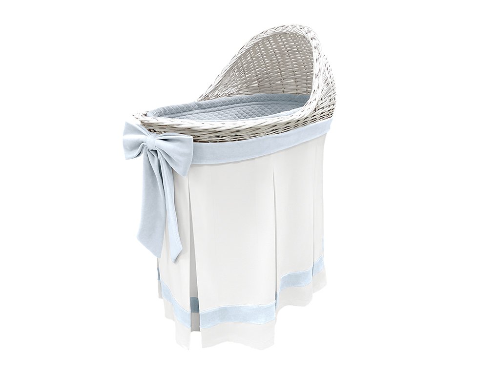 Mobile wicker bassinet with ecru skirt and blue bow