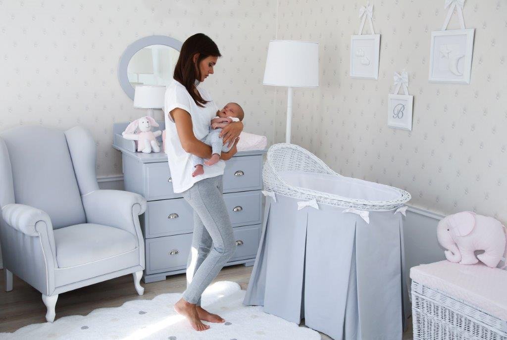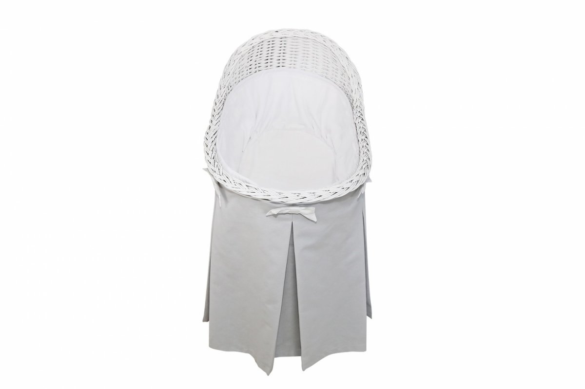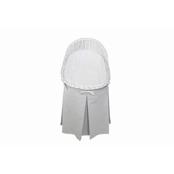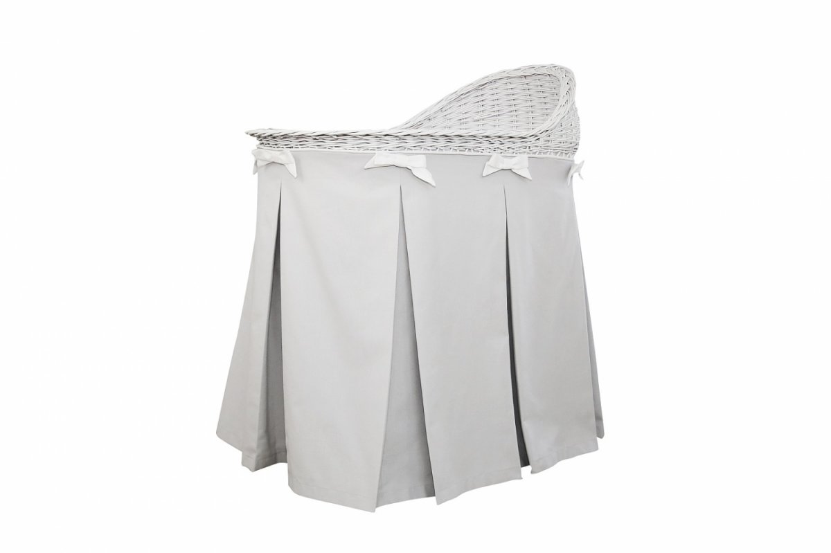 Mobile wicker bassinet with grey skirt