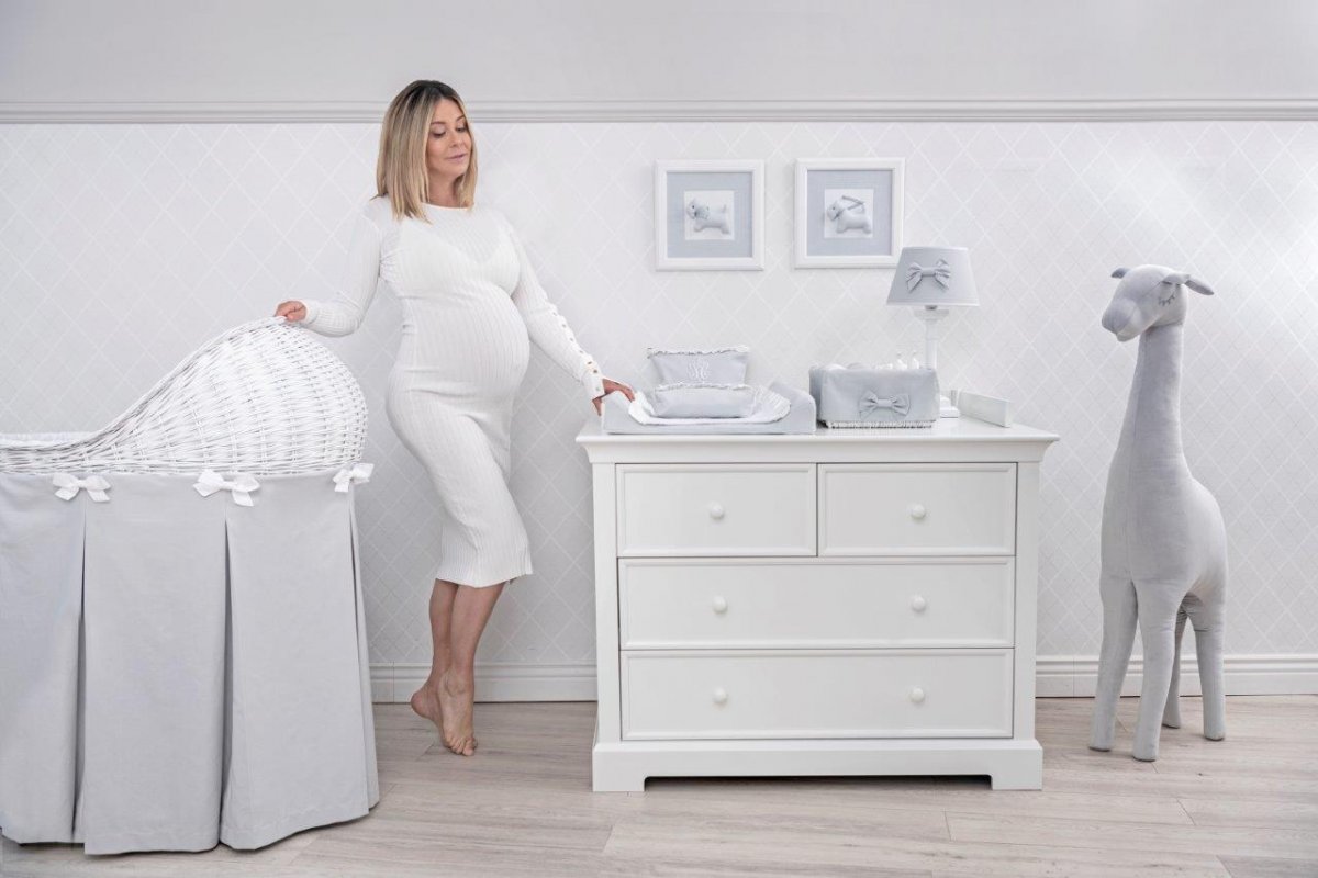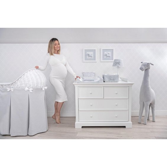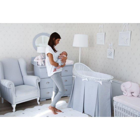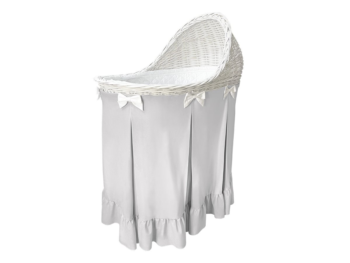 A very glam bassinet for a newborn, made from natural hand-woven Polish wicker in white colour. It is eqipped with functional chasis with wheels. The original alternative for the traditional crib in first months of child's life. A frame of the crib is trimmed with a beautiful velvet skirt in light grey colour. The skirt is decorated with pleats, flounce and velcro bows, which create a very subtle and aesthetic composition. The inside of the crib is lined with soft velour that protects a baby from injuries. There is an oval mattress at the bottom of the bassinet.