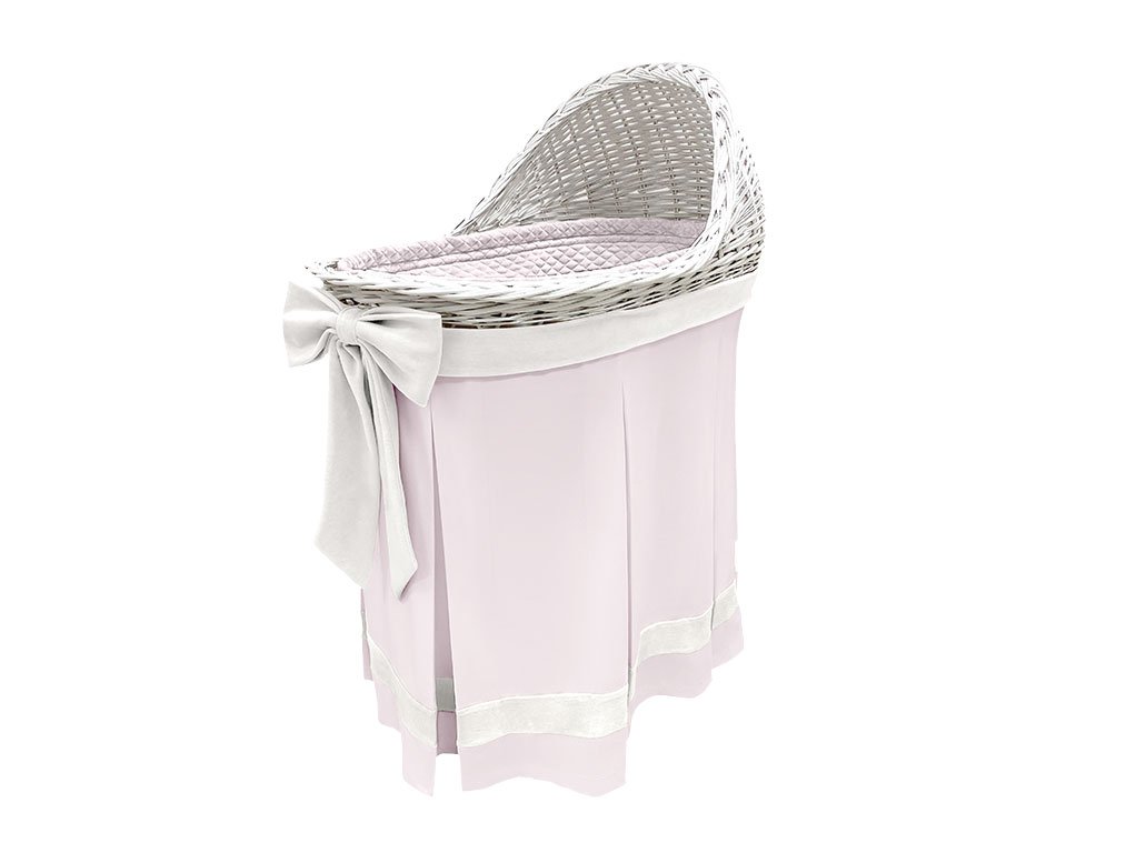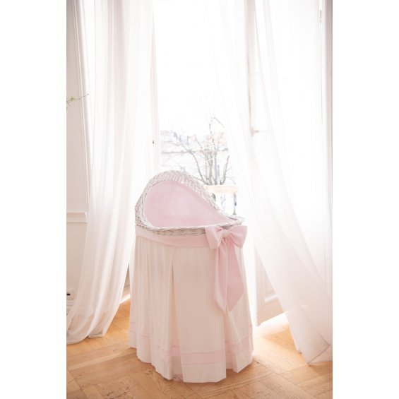 A very glam bassinet for a newborn, made from natural hand-woven Polish wicker in white colour. It's equipped with functional chassis with wheels. The original alternative for the traditional crib in first months of child's life. A frame of the crib is trimmed with a beautiful velvet skirt in powder pink color. The skirt is decorated with pleats, a stripe and ecru sash with an impressive bow. The inside of the crib is lined with quilted cotton that protects a baby from injuries. There is an oval mattress at the bottom of the bassinet.