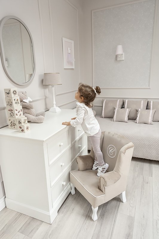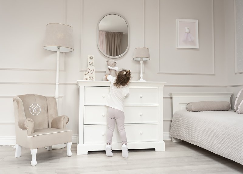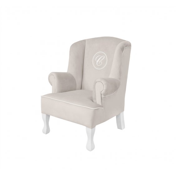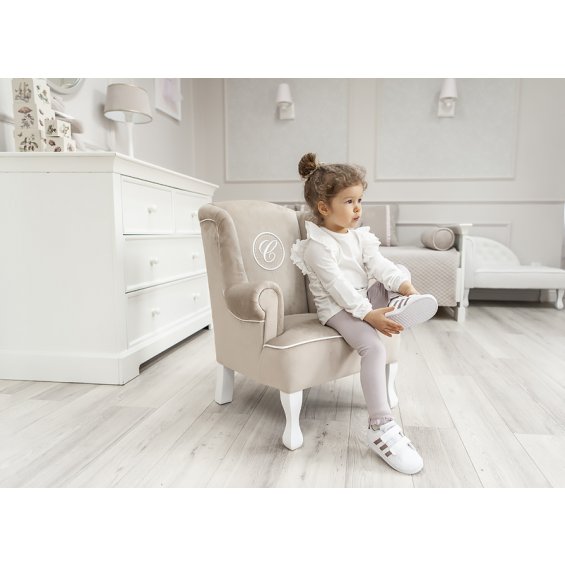 An elegant, stylized mini armchair covered with high-quality washable textile in warm and sandy beige colour. Decorated with exclusive firm emblem "C" letter. Beautiful, classic furniture that enrich every childroom.