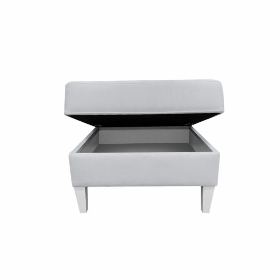 An elegant pouf made of washable light gray fabric. The pouf is also a trunk - it has an opening lid and storage space. It is a beautiful piece of furniture for the child room, the bedroom or the living room.