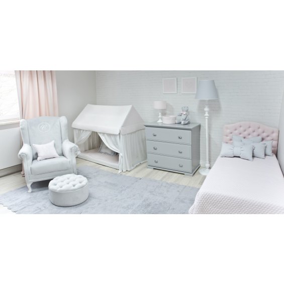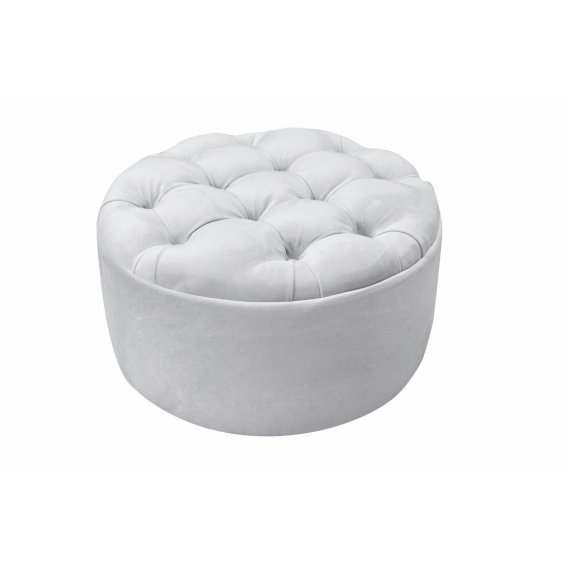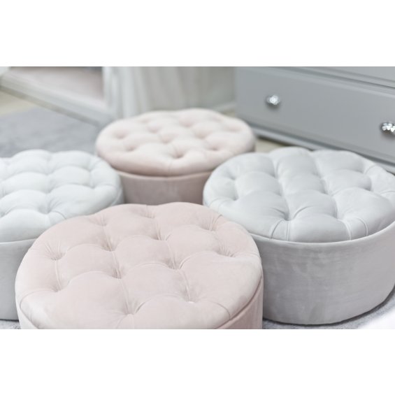 An elegant quilted pouf in Chesterfield style made of high-quality washable textile in light grey colour. A beautiful piece of furniture for the child room, the bedroom or the living room.