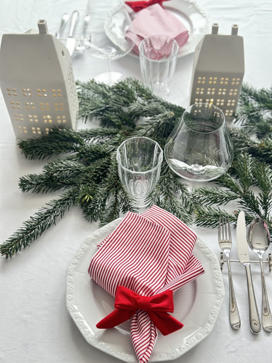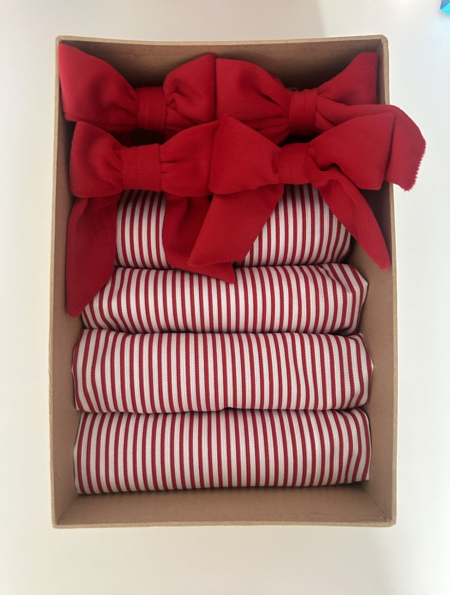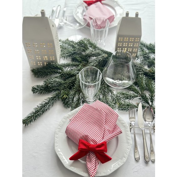A set of four napkins with bands is a stylish and elegant table decoration, perfect for Christmas meetings, dinners or family celebrations. The napkins are made of high-quality cotton. The classic red stripes pattern perfectly suits the festive atmosphere. The bands have both a practical and decorative function. They have a rim into which a napkin can be easily inserted. The wooden hoop is finished with velvet and decorated with a beautiful bow.