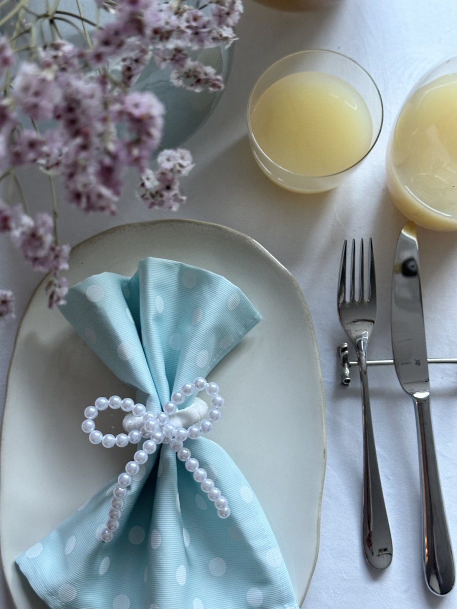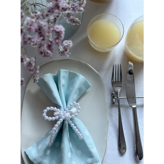 Napkin bands are an elegant and functional accessory that adds a special touch to the table during special occasions. Made of high quality materials. They have a ring in which a napkin can be easily inserted. The wooden rim is finished with velour and decorated with a bow of pearls.