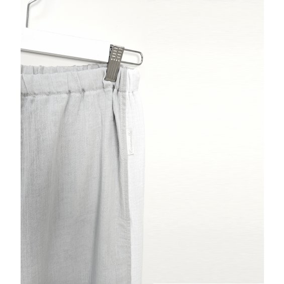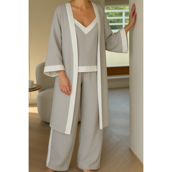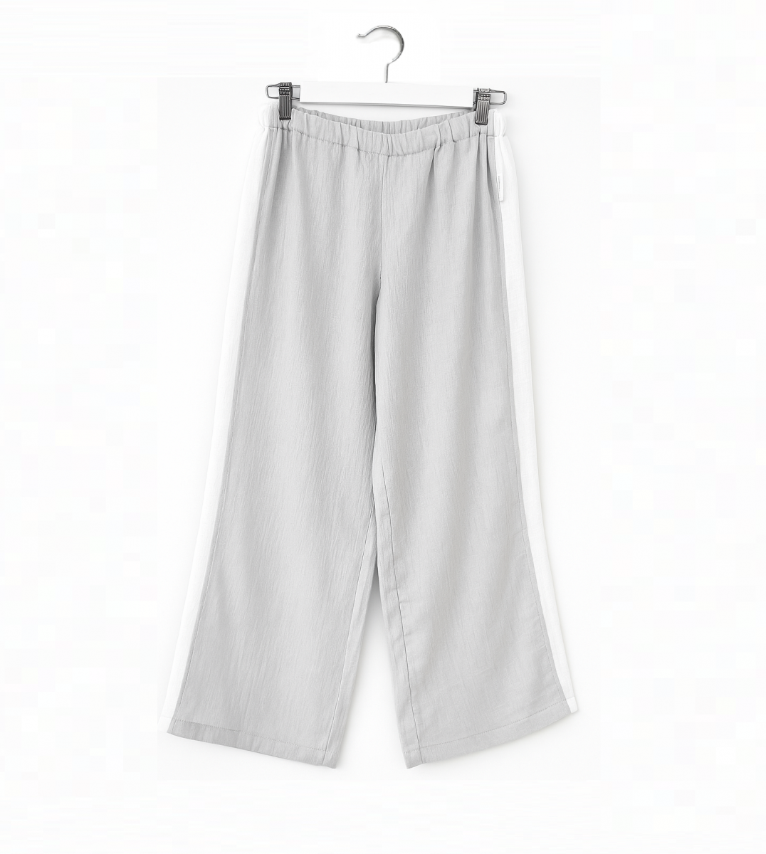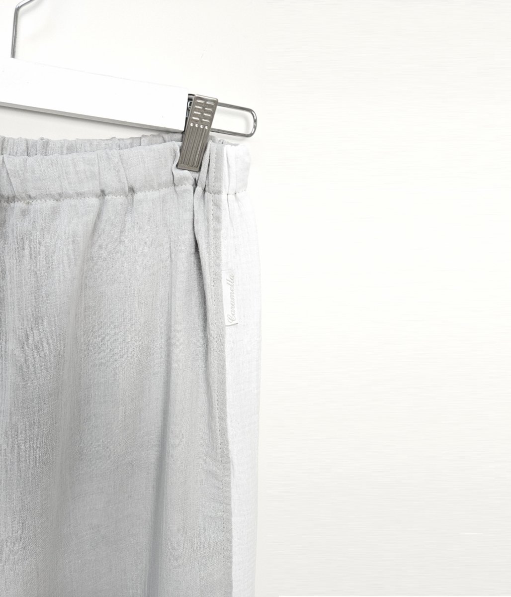 Grey muslin trousers with a side stripe, soft and breathable, perfect for sleeping or relaxing at home. The elegant stripe adds a touch of class, combining comfort with subtle style.