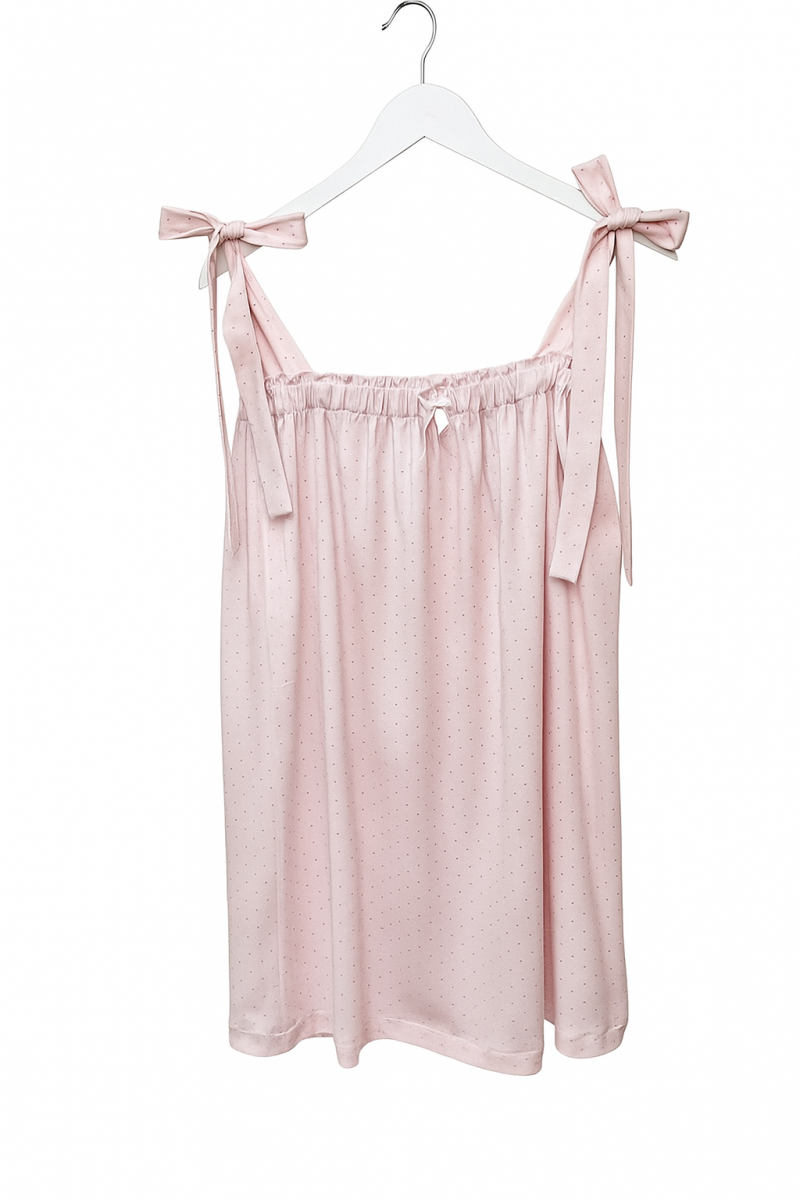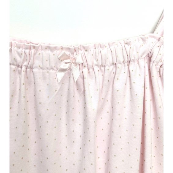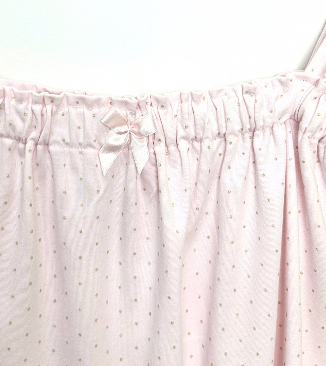 A feminine and charming nightdress is the perfect combination of comfort and subtle elegance. Made from soft, stretchy jersey fabric, it gently hugs the skin and ensures restful sleep and freedom of movement. The delicate pink shade adorned with golden polka dots gives it a romantic character and a touch of luxurious shine. Adjustable, tie-up straps not only emphasize its light, girly style but also allow the nightdress to be tailored to the silhouette. An excellent choice for peaceful nights, lazy mornings, and cozy moments of home relaxation..