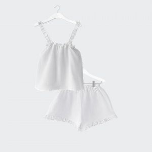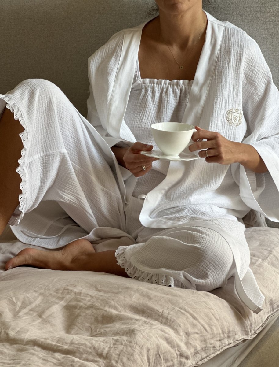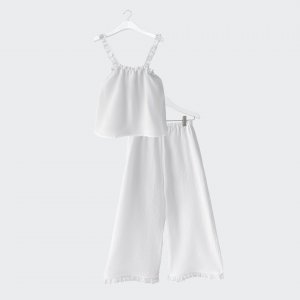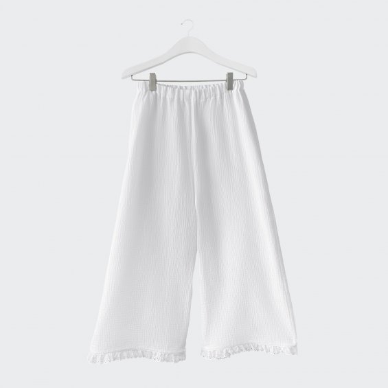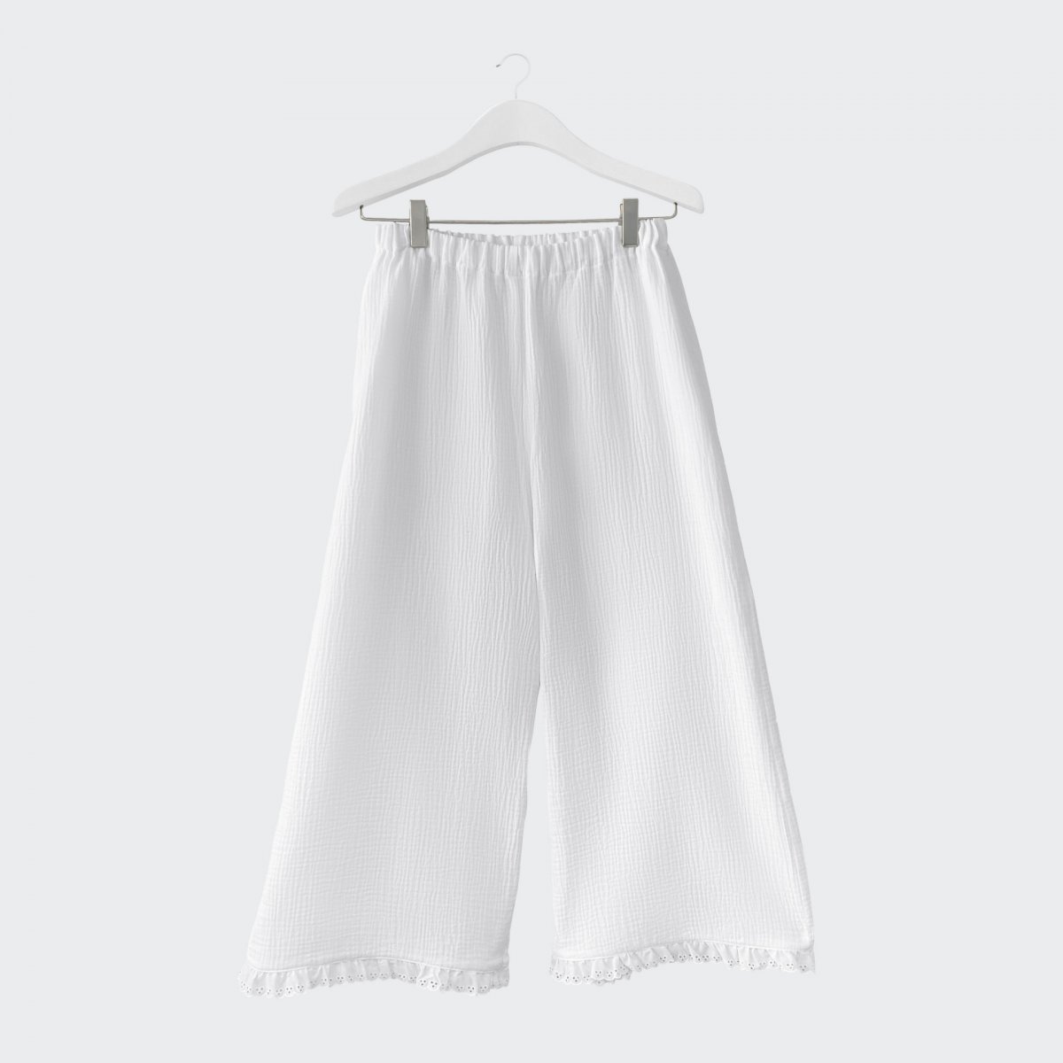 White culotte trousers made of airy muslin finished with richelieu lace.