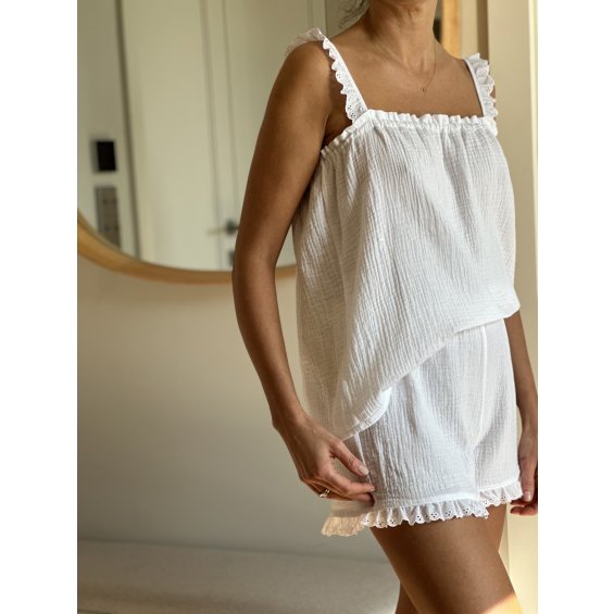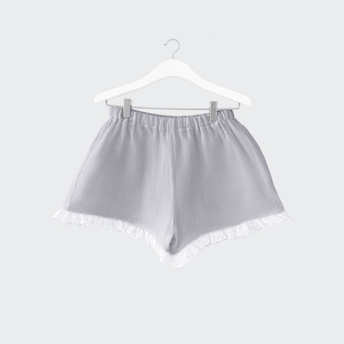 Grey shorts made of airy muslin finished with white richelieu lace.
