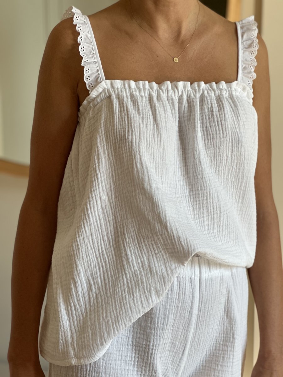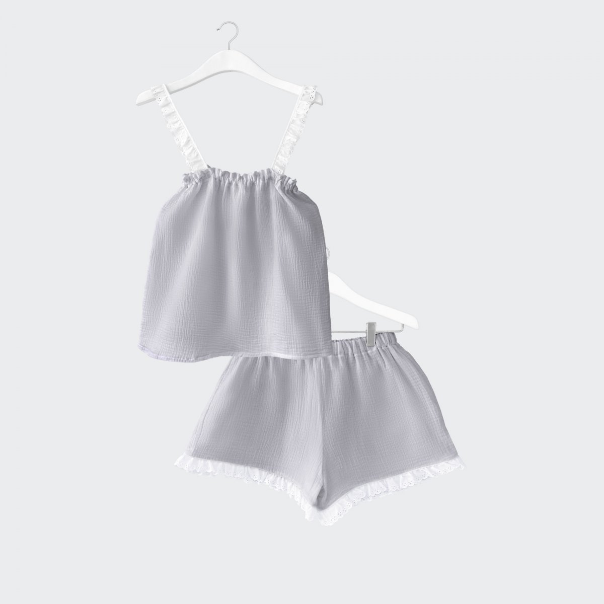 Grey muslin set finished with white richelieu lace - top and shorts.