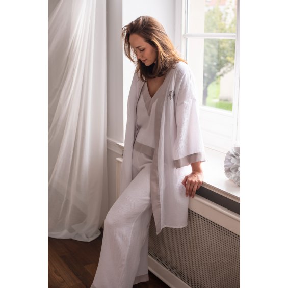 White muslin set finished with biege decorative cuffs - top and wide leg trousers.