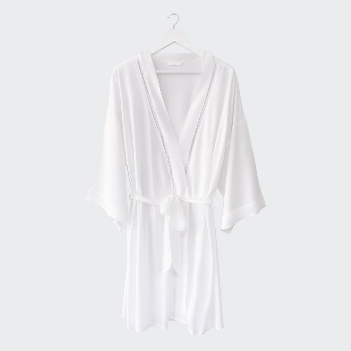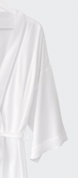A white kimono made of flowing, body-friendly fabric decorated with hemstitching.