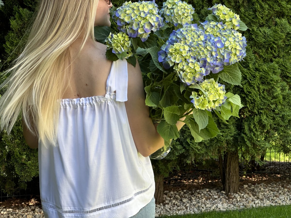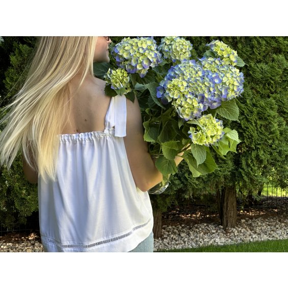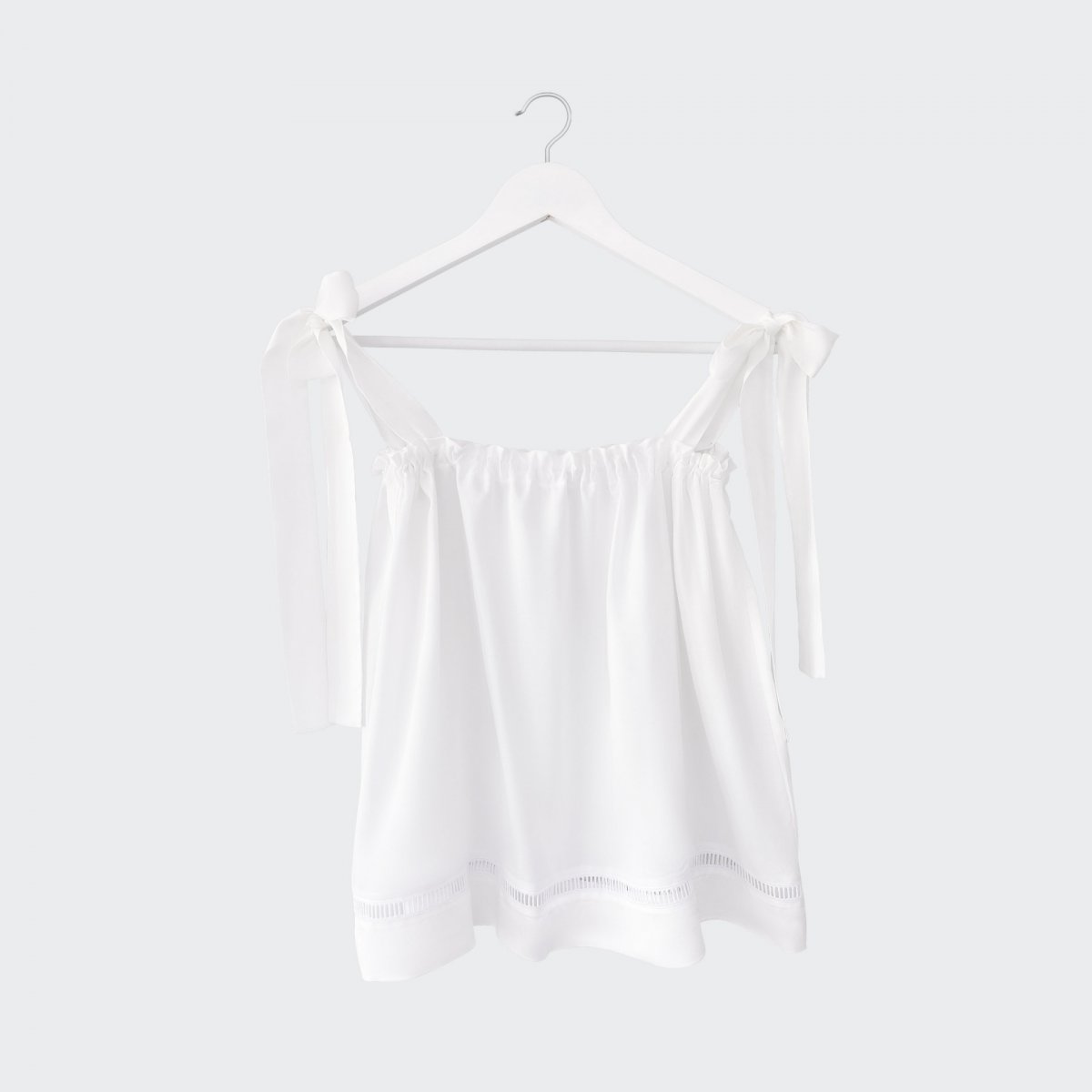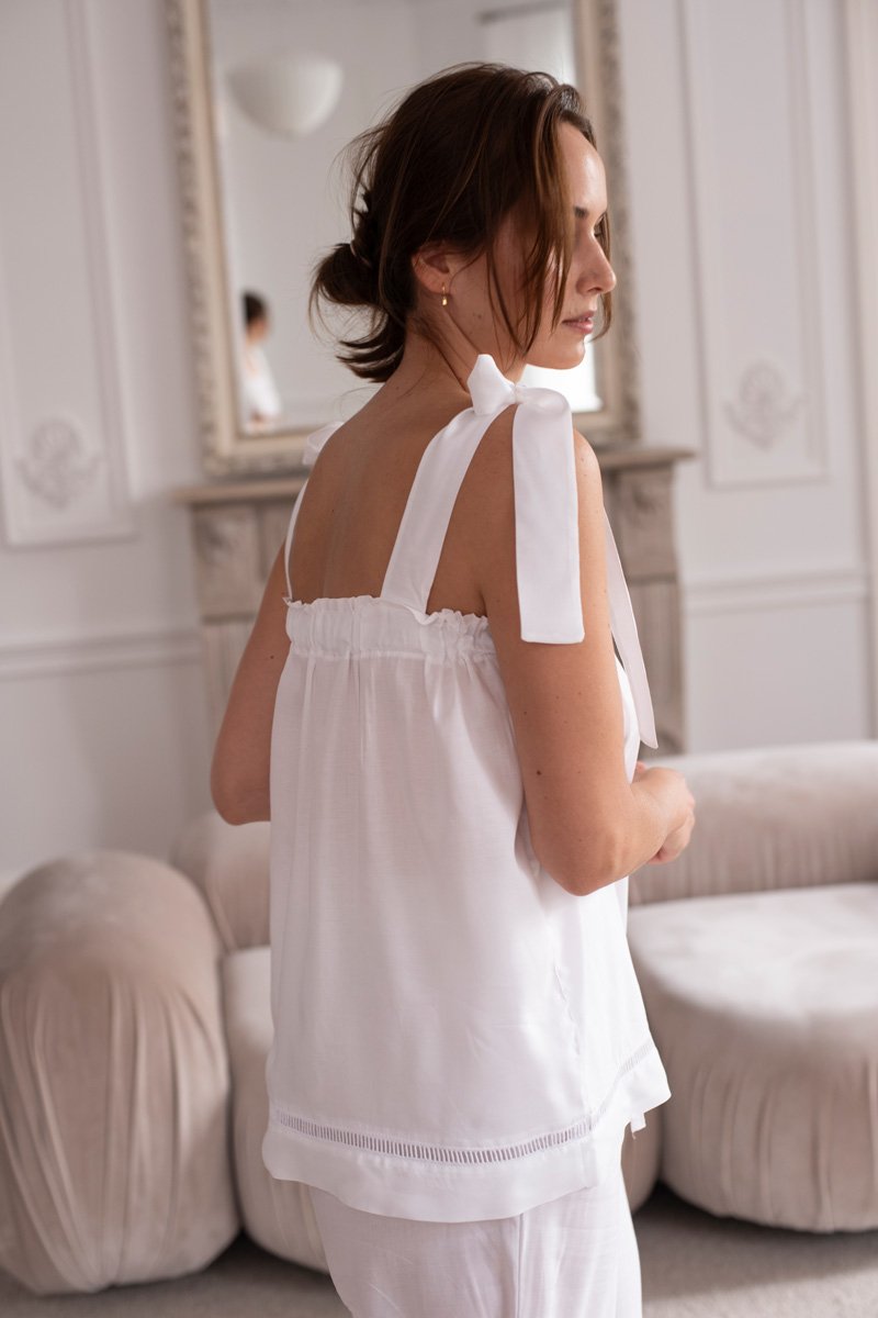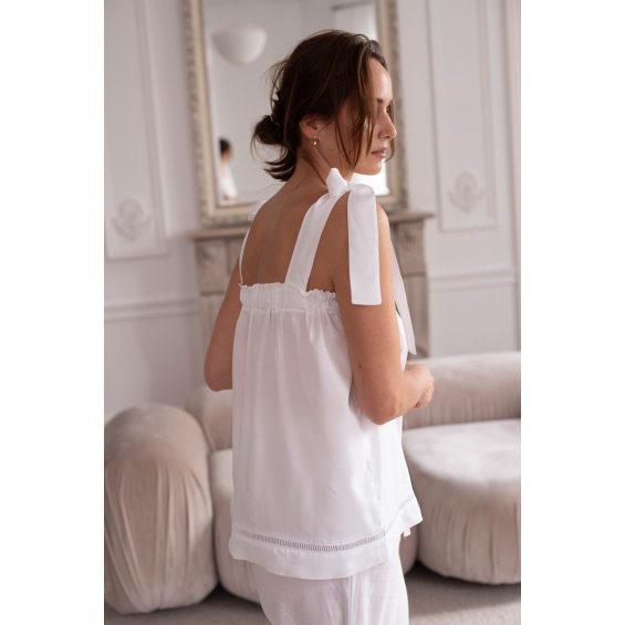 A white top with a decorative tie, made of flowing, body-friendly fabric decorated with hemstitching.