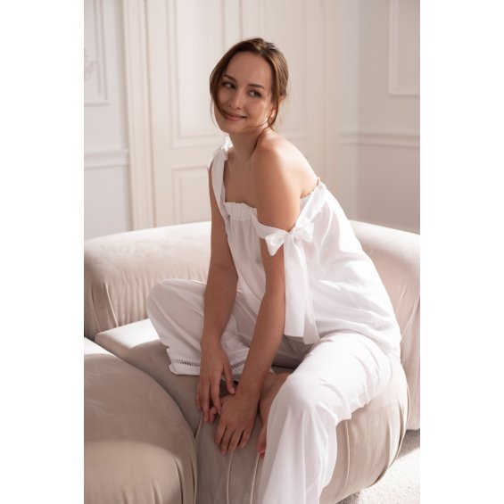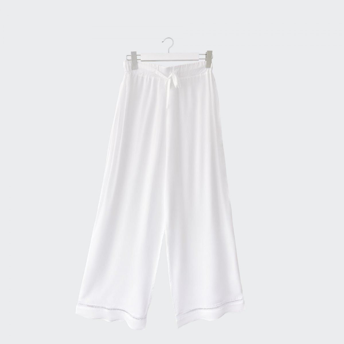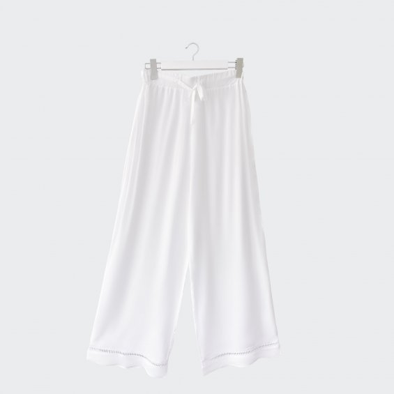 White wide leg trousers made of flowing, body-friendly fabric decorated with hemstitching.