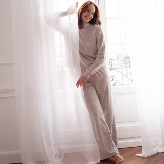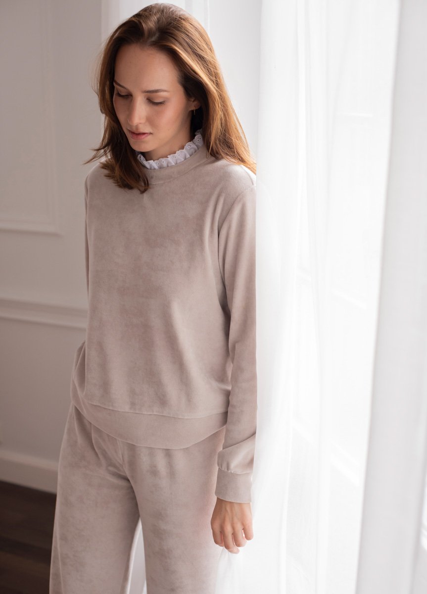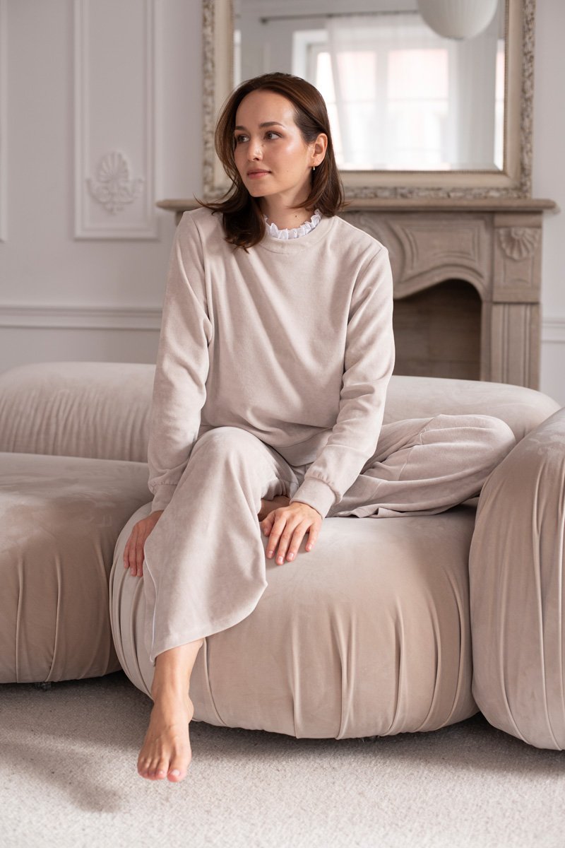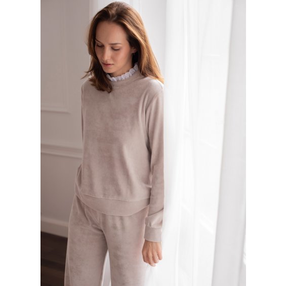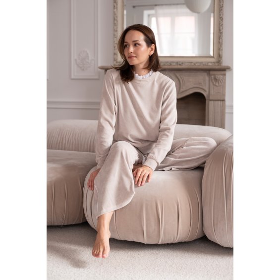 A very comfortable set consisting of a velour brown blouse with a decorative lace collar and pants. Made of soft, fleshy and pleasant to the skin velour. The collar is pinned to the blouse, also you can wear it with or without the collar.