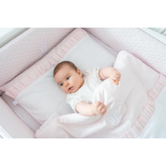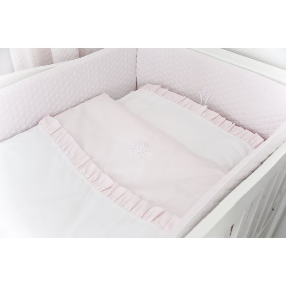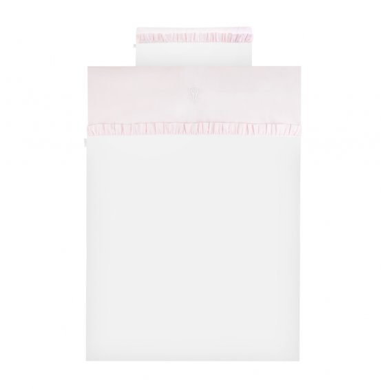 Beautiful and girly bedclothes composed of elegant white cotton textile with baby pink elements. Cases for a pillow and a quilt are decorated with adorable flounce. The bedding is decorated with elegant white company embroidery. The product may be a perfect gift.