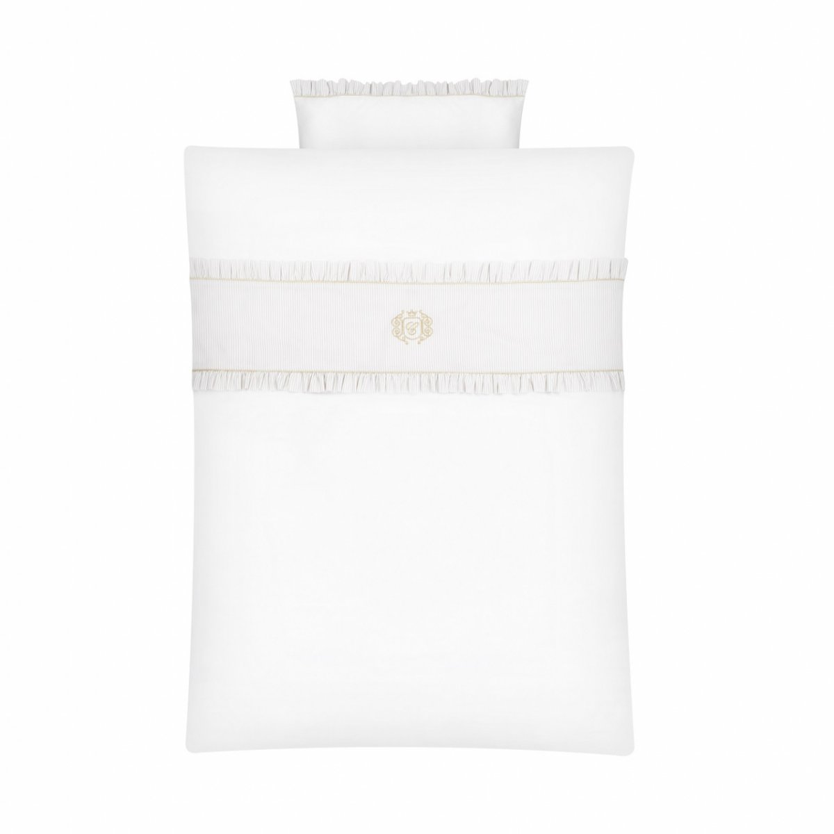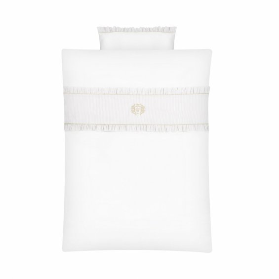 Beautiful bedding made of white satin cotton and with a panel and a cushion in white and beige stripes. It's decoreted with an elegant gold emblem and an adorable flounce. The product may be a perfect gift.