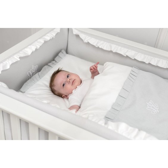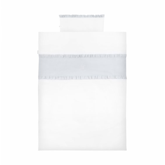 Beautiful bedding made of white satin cotton and with a panel in light grey colour. It's decoreted with an elegant emblem and an adorable flounce. The product may be a perfect gift.