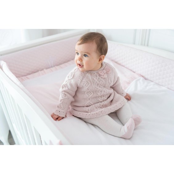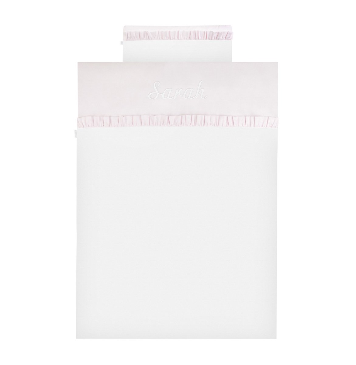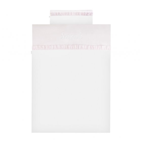 Beautiful and girly bedclothes composed of elegant white cotton textile with baby pink elements. Cases for a pillow and a quilt are decorated with adorable flounce. The bedding is decorated with elegant embroidery with your child's name. The product may be a perfect gift.