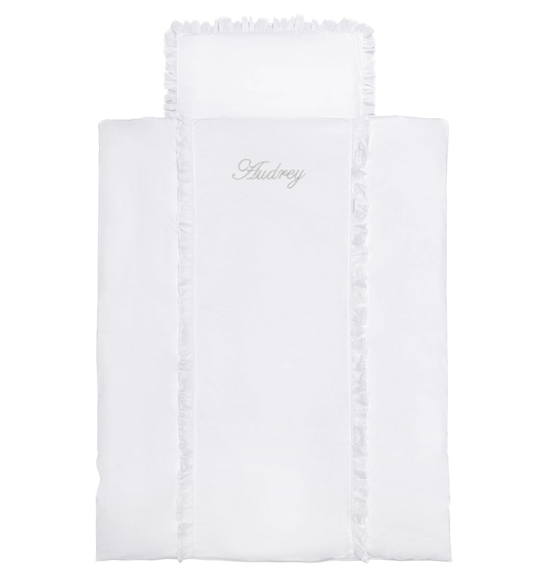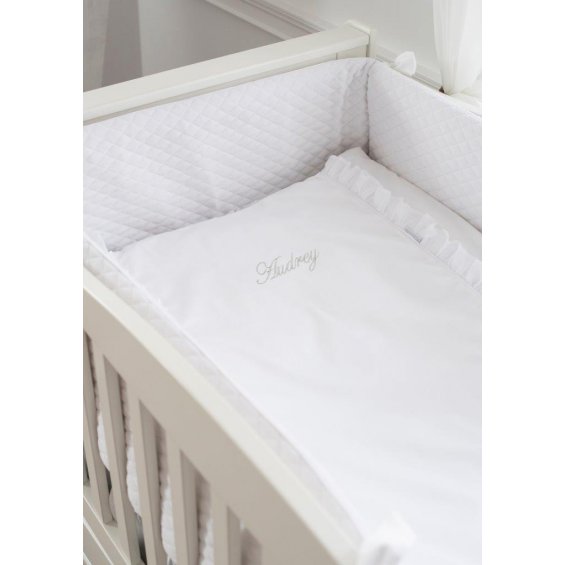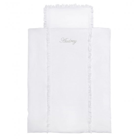 Delightful, girly bedding, elegant combination of white satin cooton with delicate transparent frill. Bedding decorated with silver embroidery with your child's name. The product is perfect for a gift.