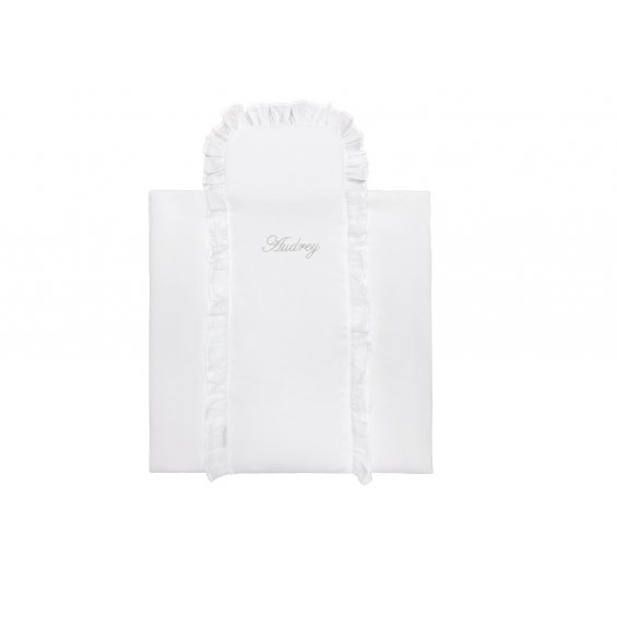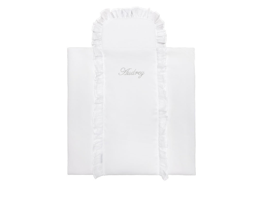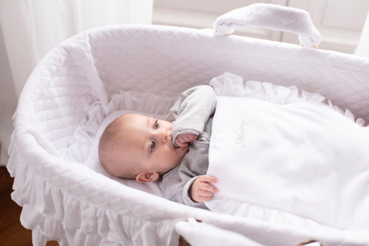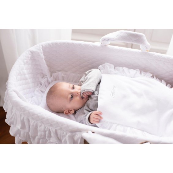 Luxury mini bedding for the Moses' basket. Also ideal for a gondola, cradle and wicker bassinet. The bedding has a filling and is decorated with adorable voile flounce and emroidery with your child's name.