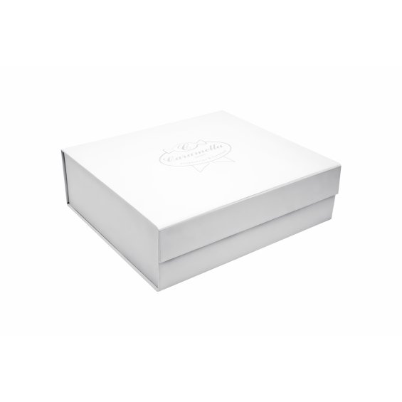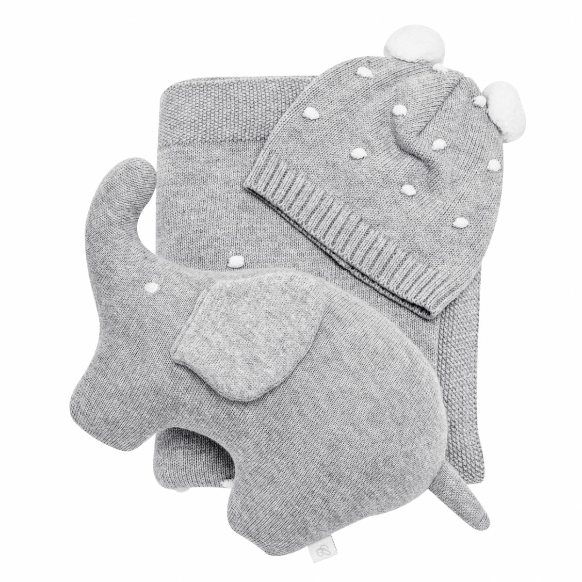 A beautiful knitted set for a small child in grey. The set consists of a cute elephant toy and hats and a blanket, which were decorated with tiny white balls. The products are packed in an elegant box, so the set will be a great gift idea for the baby.