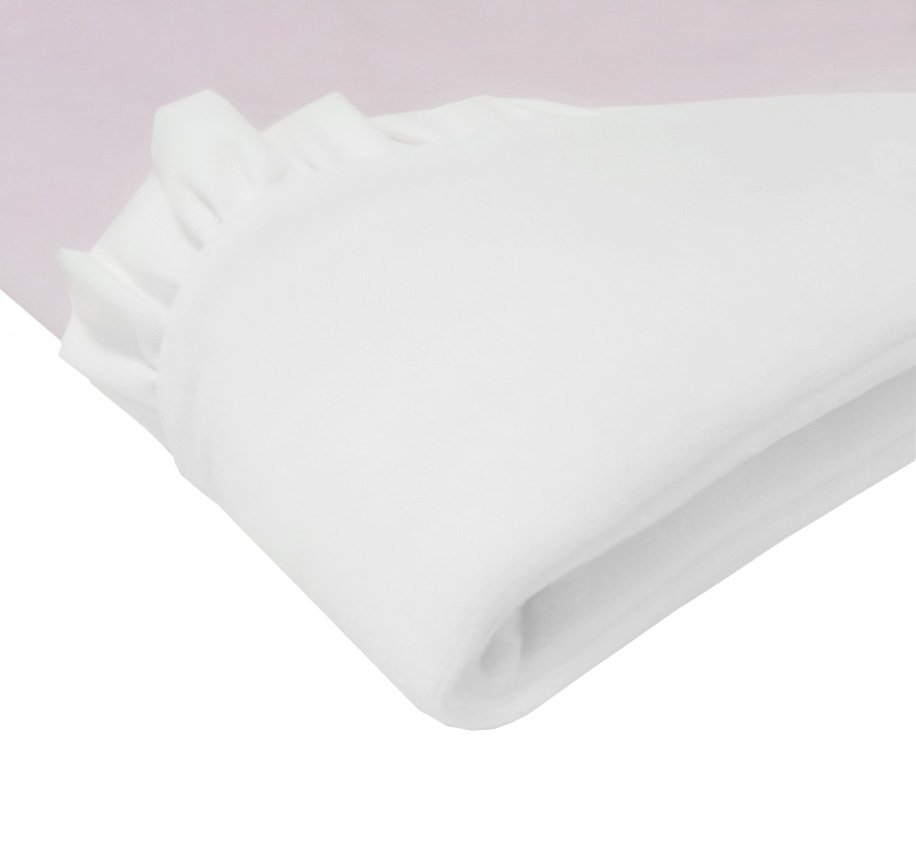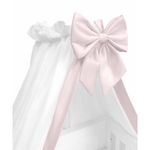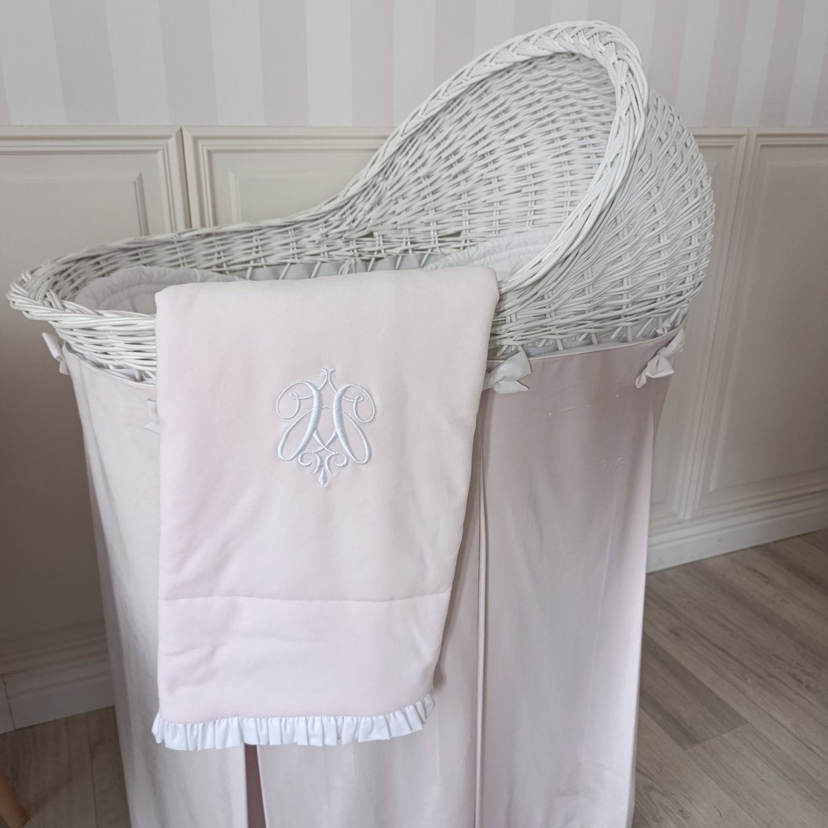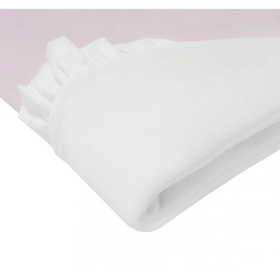 A charming velour blanket in the color of delicate powder pink. Decorated with a decorative frill and a stylish emblem. It will be a great complement to a layette for a girl and a good idea for a gift for a child.