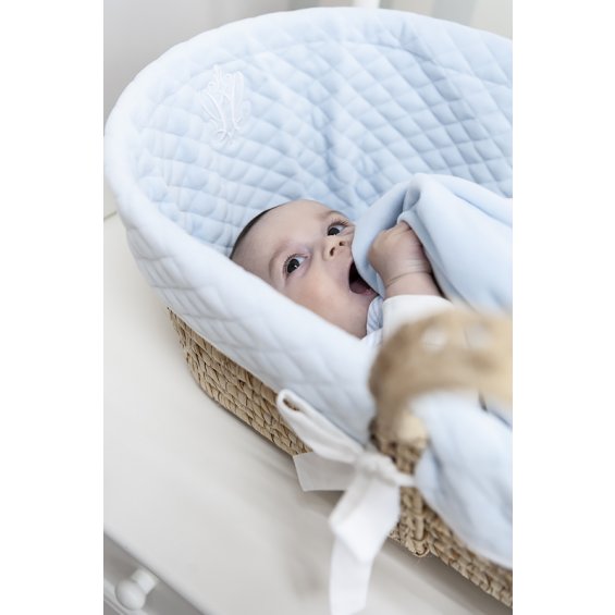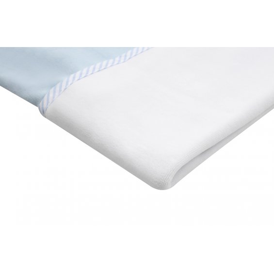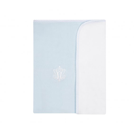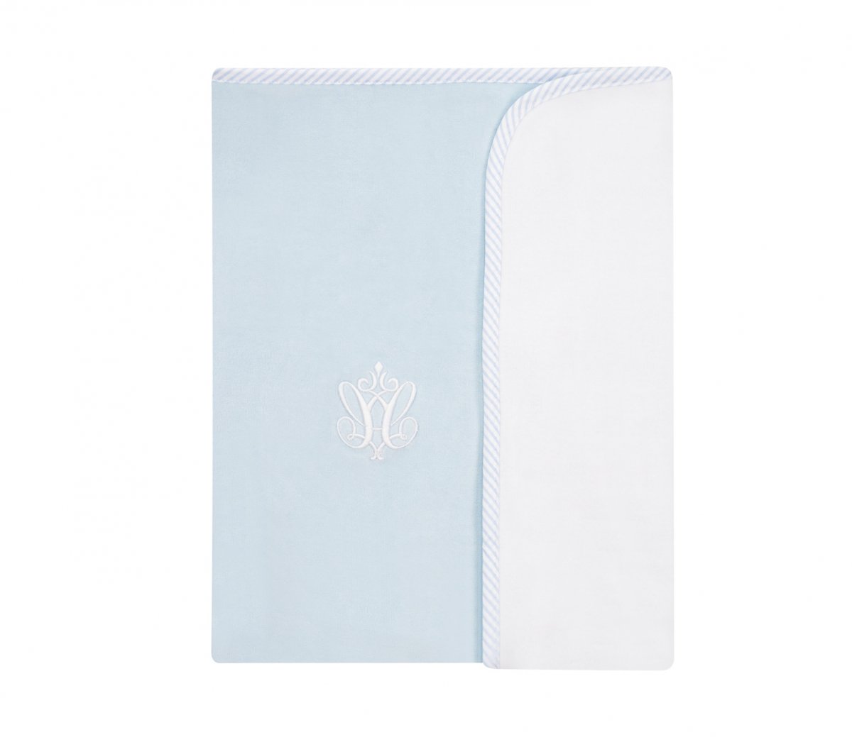 Elegant double-sided velour blanket - blue on one side and white on the other. Decorated with a stylish company emblem. Blanket will be a great complement to a layette for a boy and a good idea for a gift for a child.