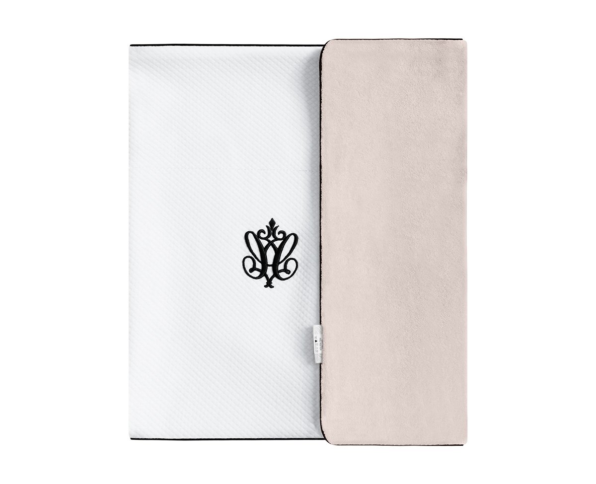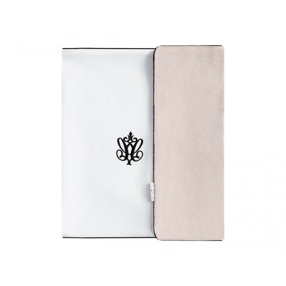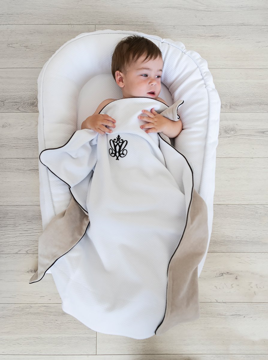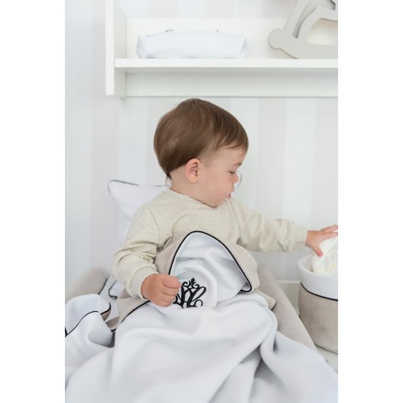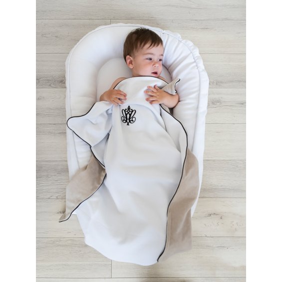 Warm blanket made of white waffle fabric and soft velour in beige color. Decorated with a black inset and embroidery.