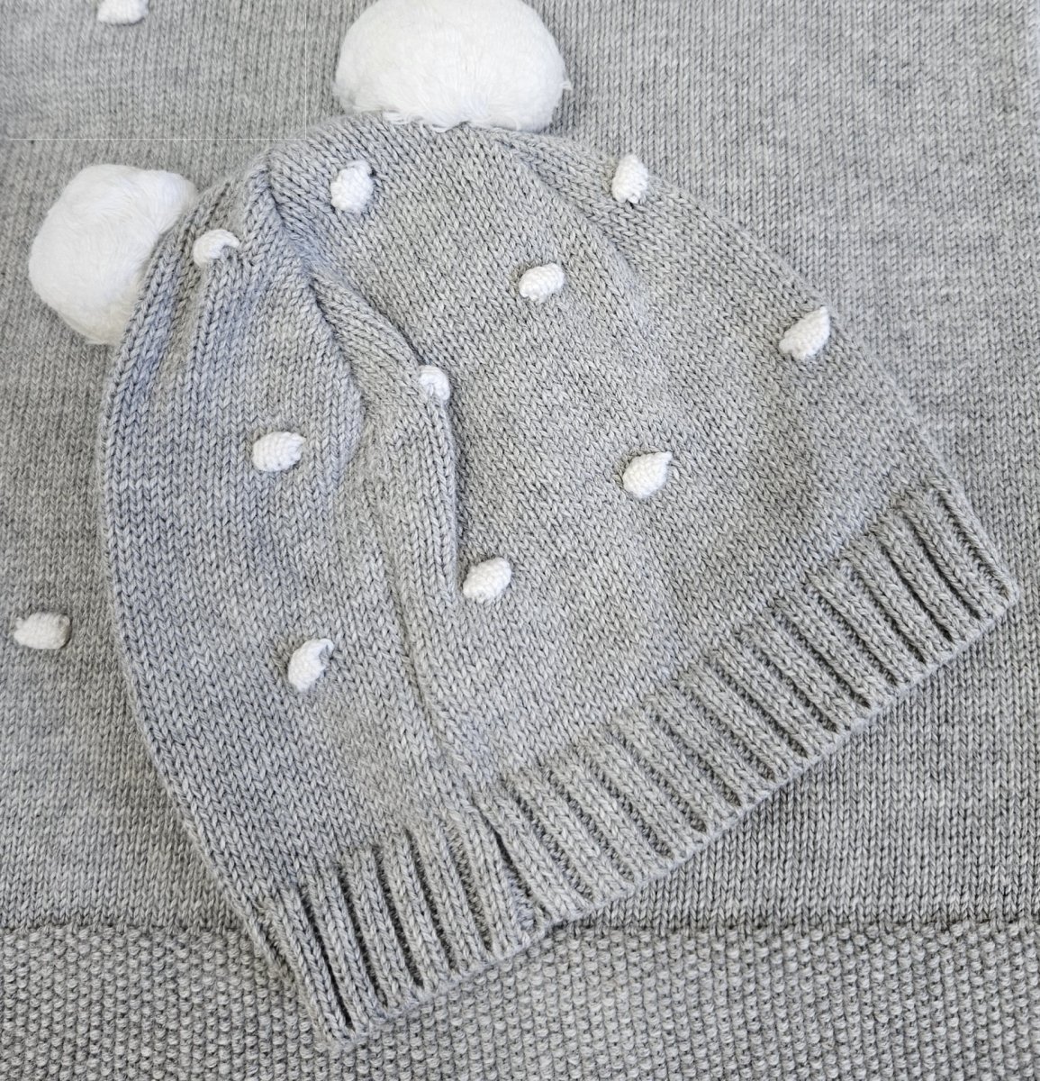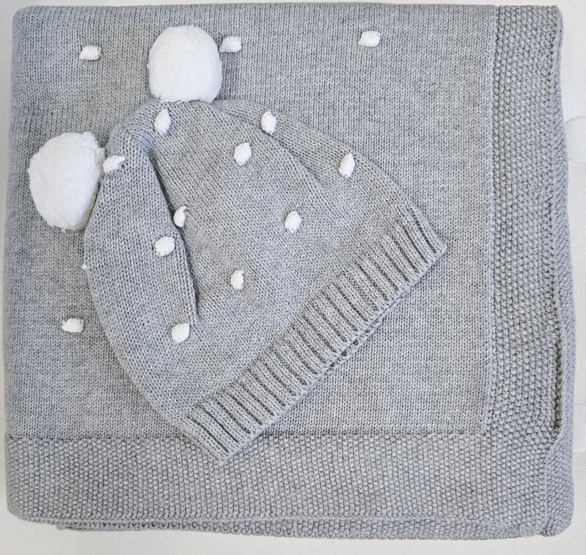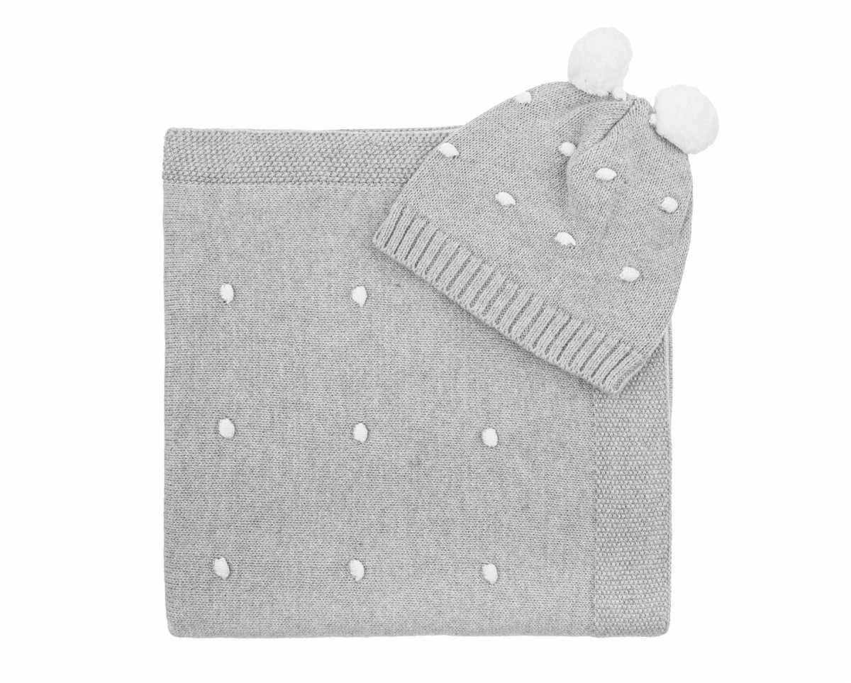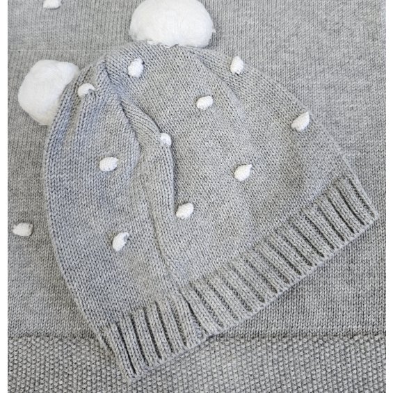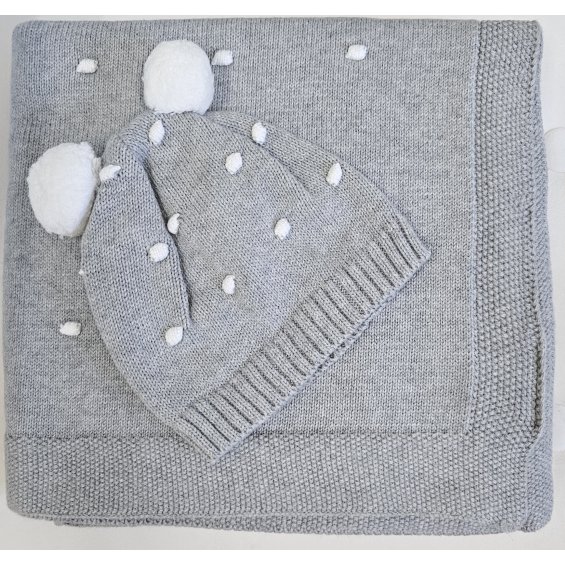 A beautiful knitted set for a baby in grey color. It consists of a tiny hat and blanket, which were decorated with tiny white balls. The set will work very well in the first months of a baby's life.