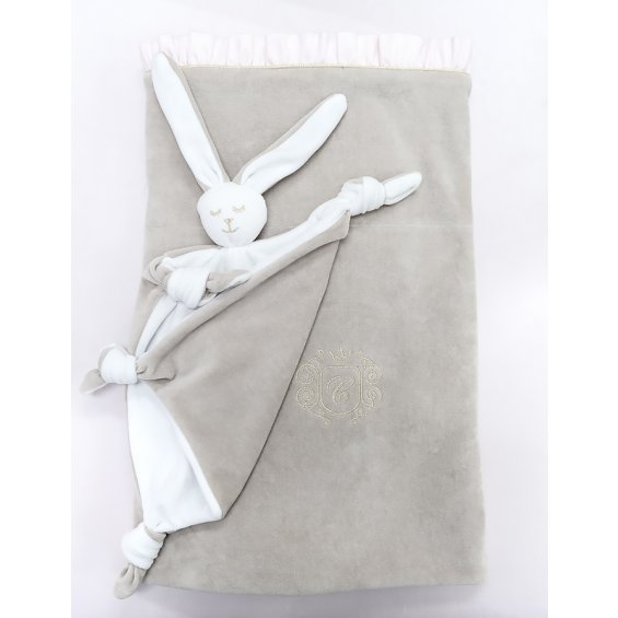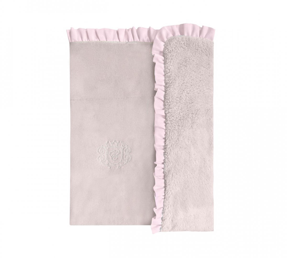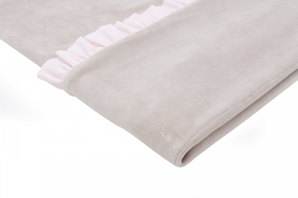 Warm blanket in sand beige color made of soft velour and plush textile. Decorated with a golden company emblem and a pink flounce.