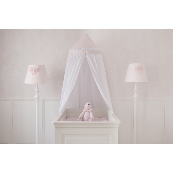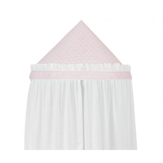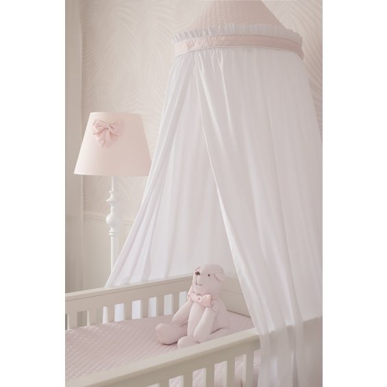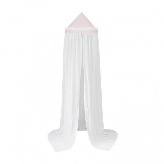 A beautiful hanging canopy for the child's room. Made of white delicate cotton and pink quilted cotton, finished with a lovely frill. The canopy is suspended from the ceiling, it is suitable for a baby cot and a large bed.