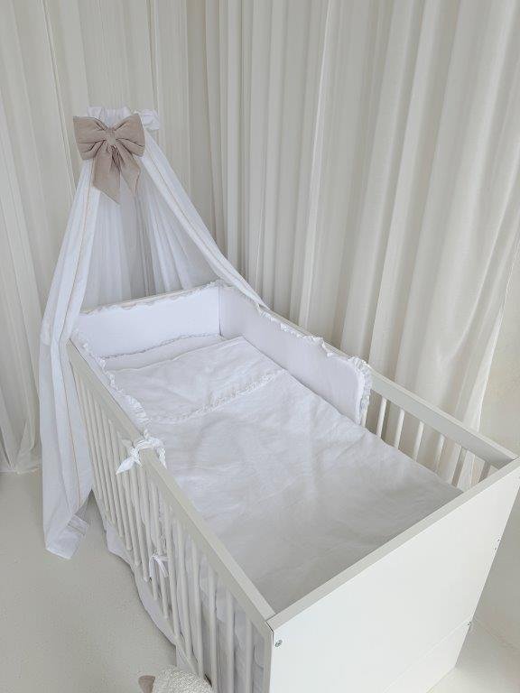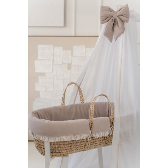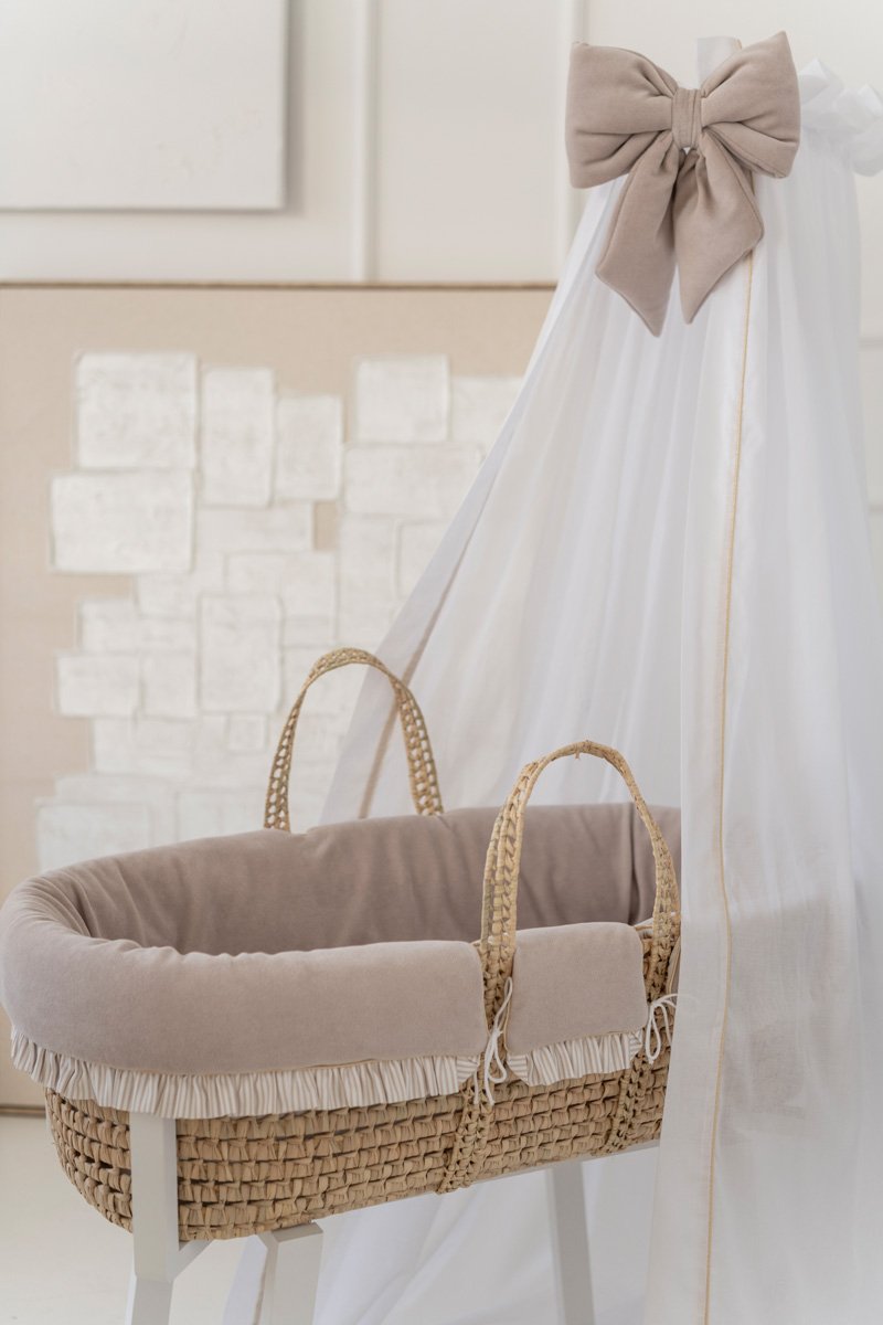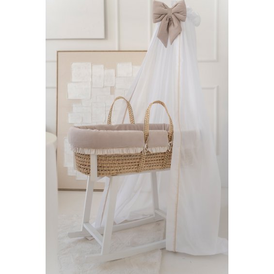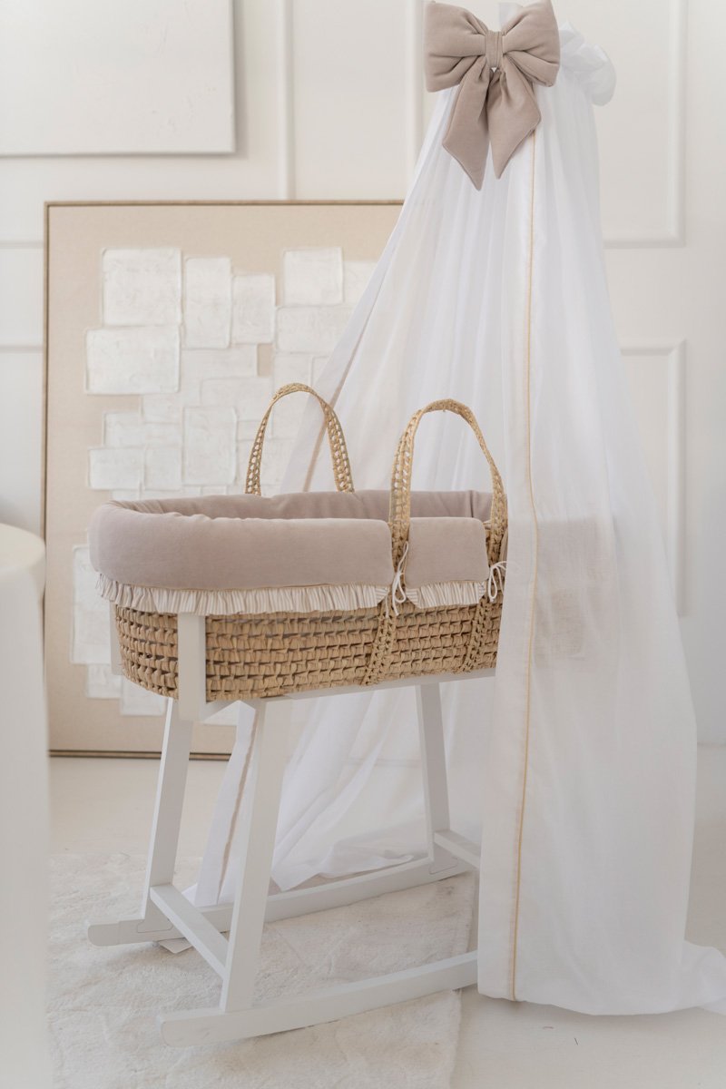 Elegant canopy made of light, delicate fabric, adorned with a beautiful, soft velvet bow in a subtle beige shade. The design is complemented by a refined golden braid, giving the decoration a luxurious and unique character. Perfect for creating a cozy atmosphere in a child's room, adding a touch of class and elegance.