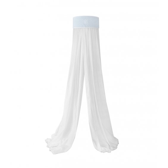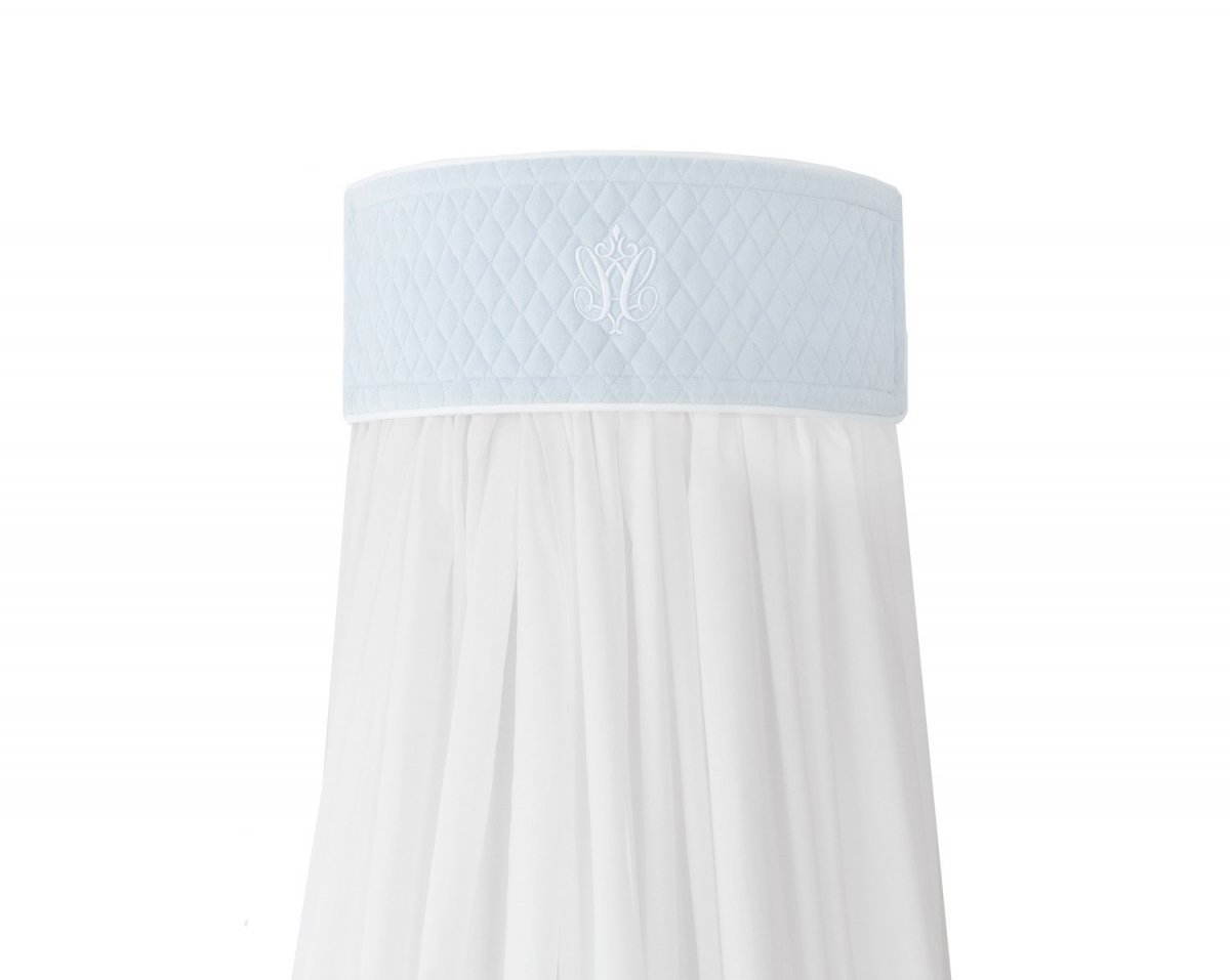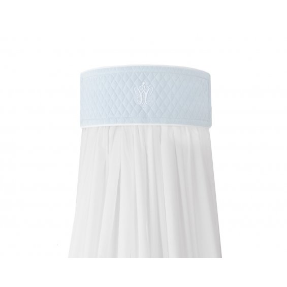 A beautiful canopy to the child's room. Made from lightweight transparent white voile and enhanced with elegant mounting in the form of a semi-circle. The fixing is covered with a baby blue quilted velour finished with a white inset and decorated with an elegant embroidery. The frame has been designed so that the fabrics and the decorative part of the fixing can be easily removed for washing.