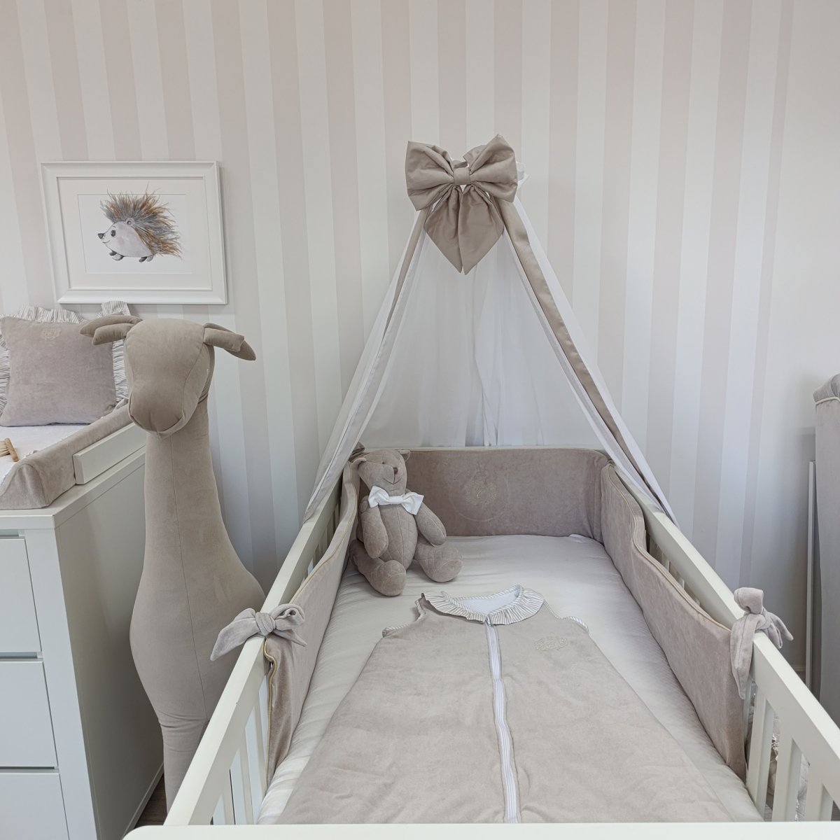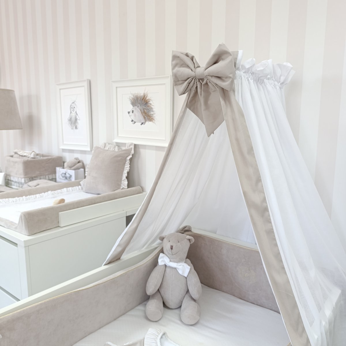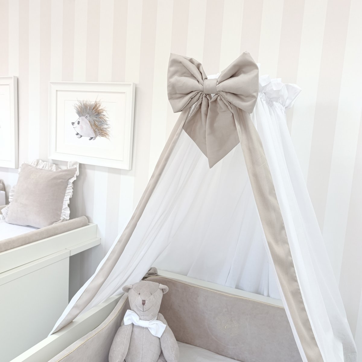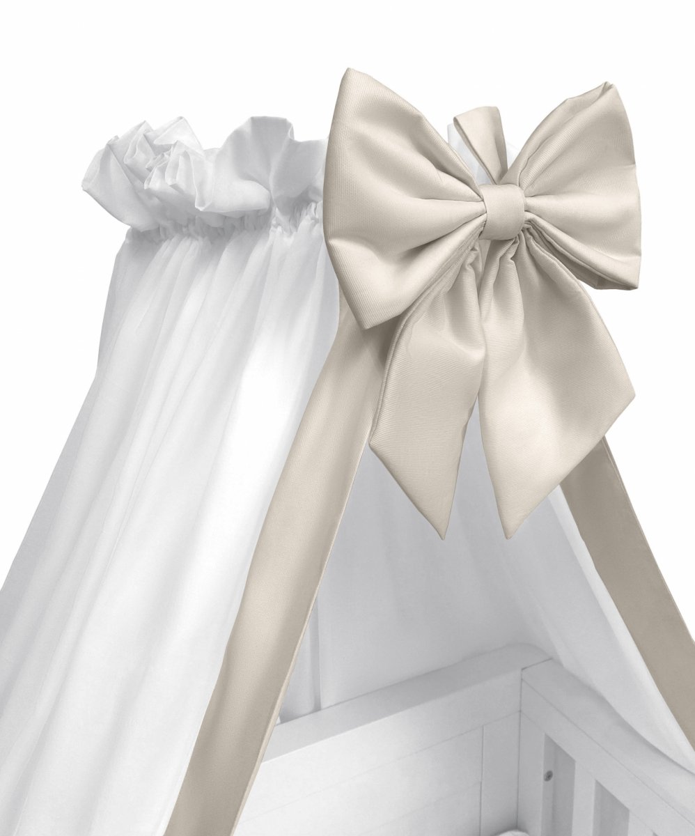 Elegant standing canopy for children's room. It is made of white satin cotton and decorated with beige piping and a large beige bow. The canopy is a beautiful accessory that will make your baby's crib cozier and your little one will feel safer.