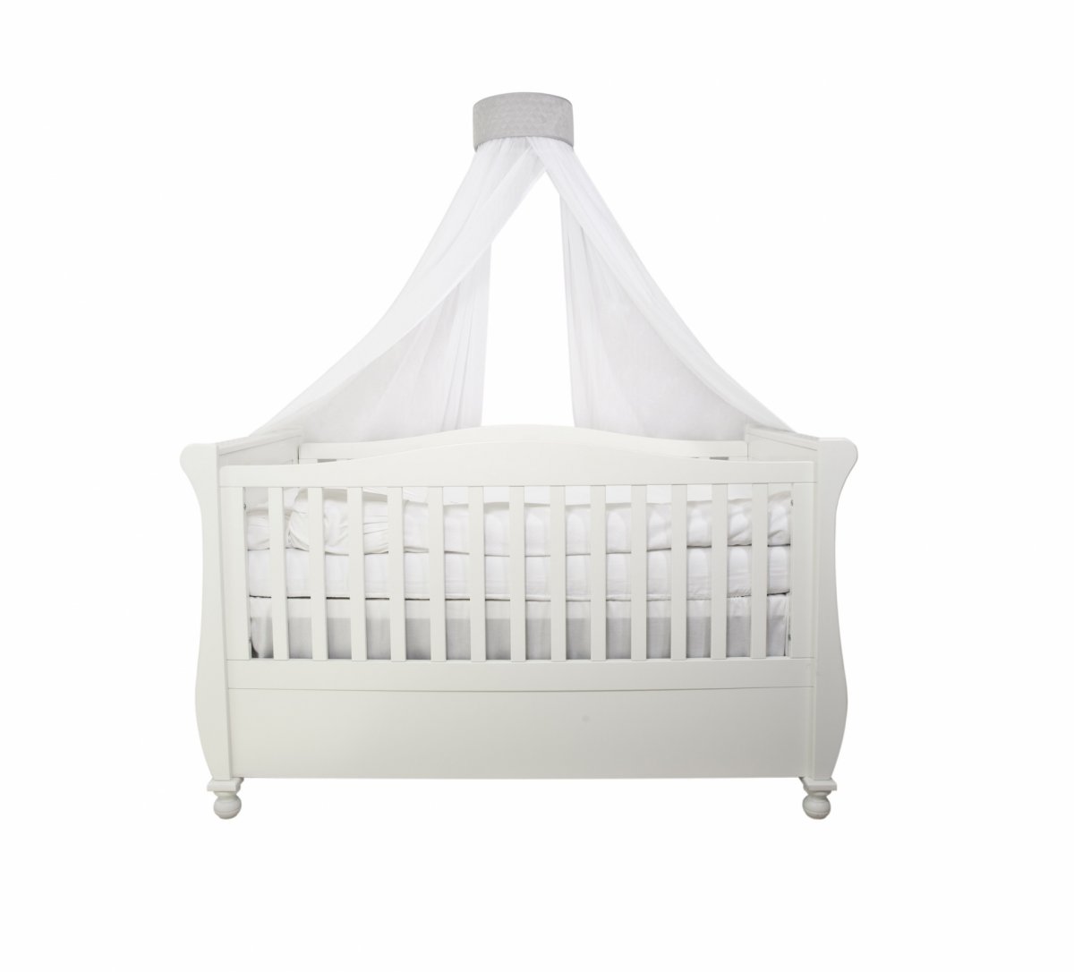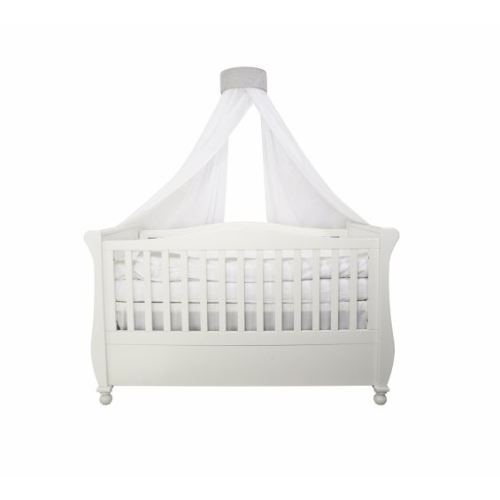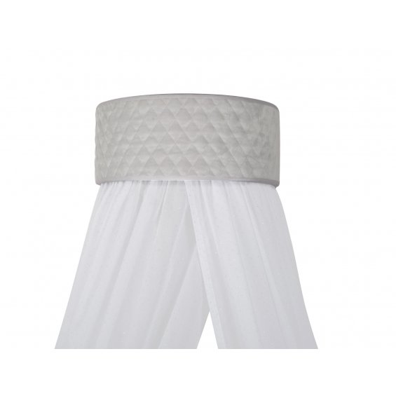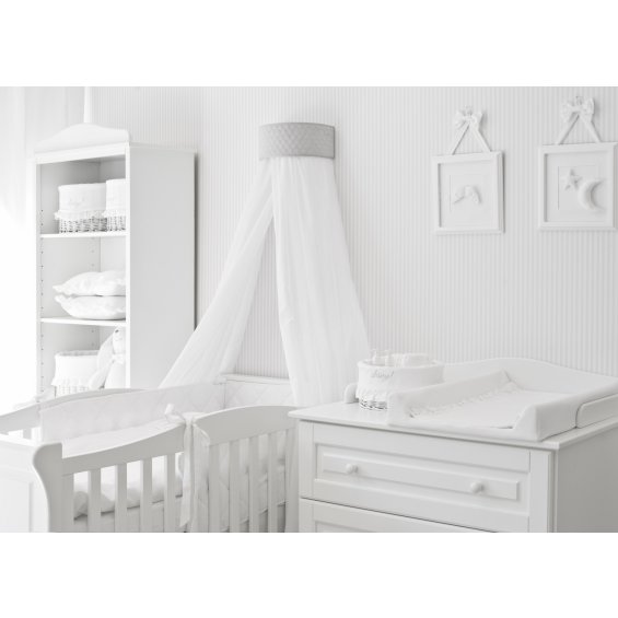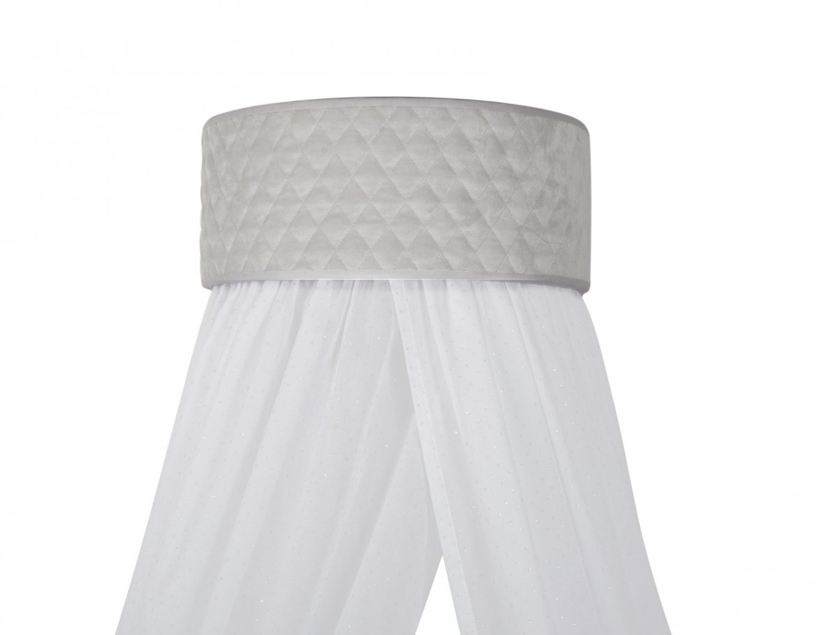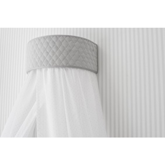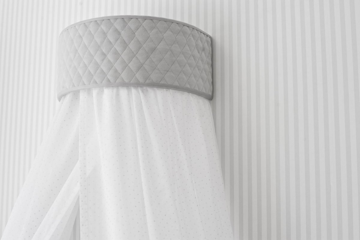 A beautiful baldachin for a child room. Made of elegant cotton with little shining silver dots and composed with light grey quilted wall attachement. The frame has been designed so that the fabrics and the decorative part of the fixing can be easily removed for washing.
