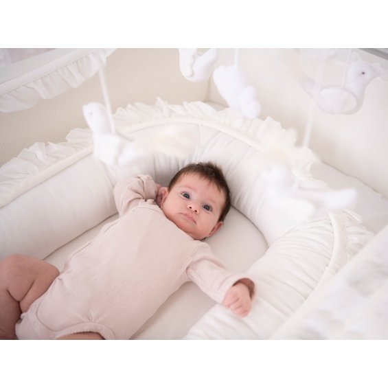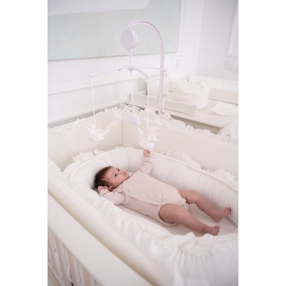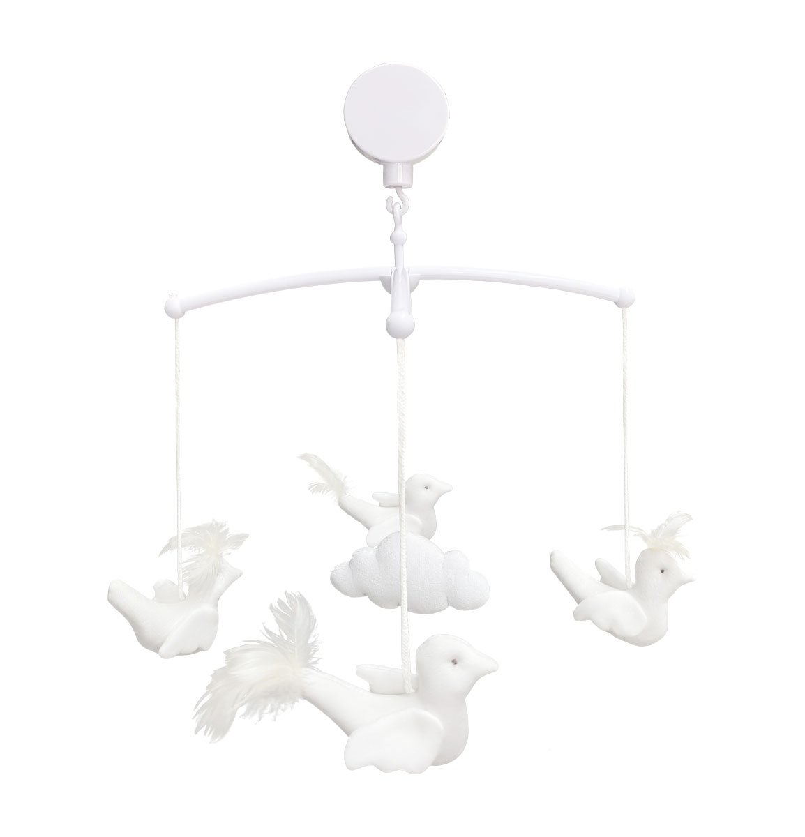 A baby cot carousel with lovely ivory birds. The headband of the carousel is combined of few parts which have to be connected. The music box should be hung on top of the headband. The music box plays a relaxing melody. The carousel is mounted to the side of the bed.
