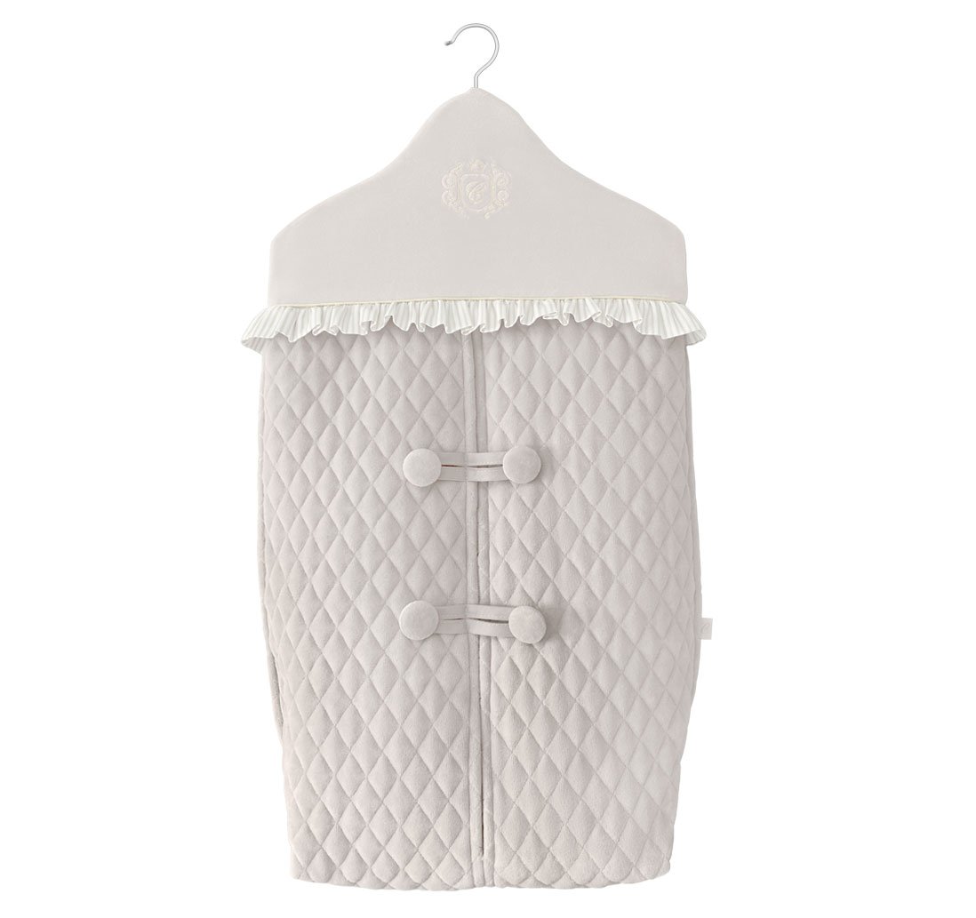 Practical diaper organizer made of quilted velour in a beige colour. Decorated with a embroidery and fancy fastening. It has a hanger that allows you to hang it on a bed, chest of drawers, or wardrobe door.
