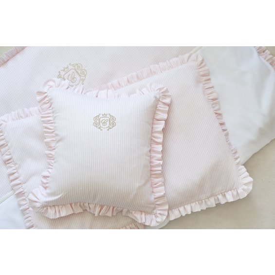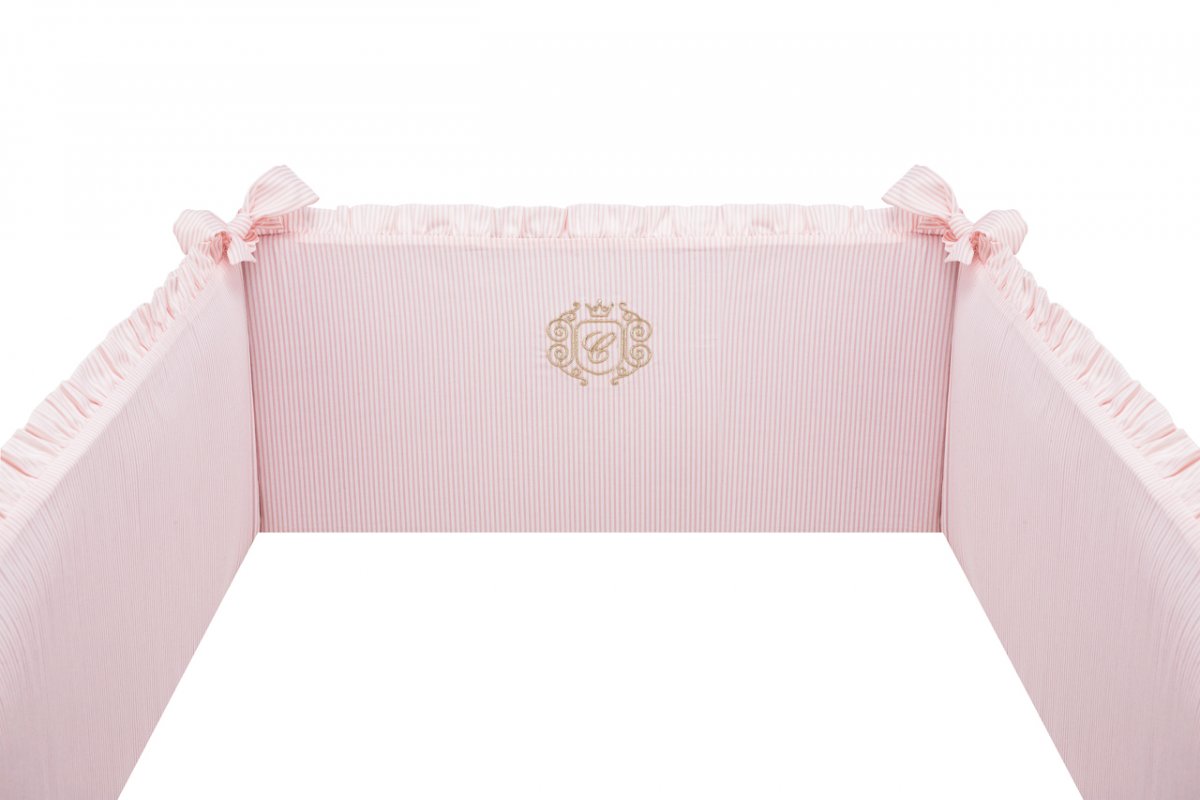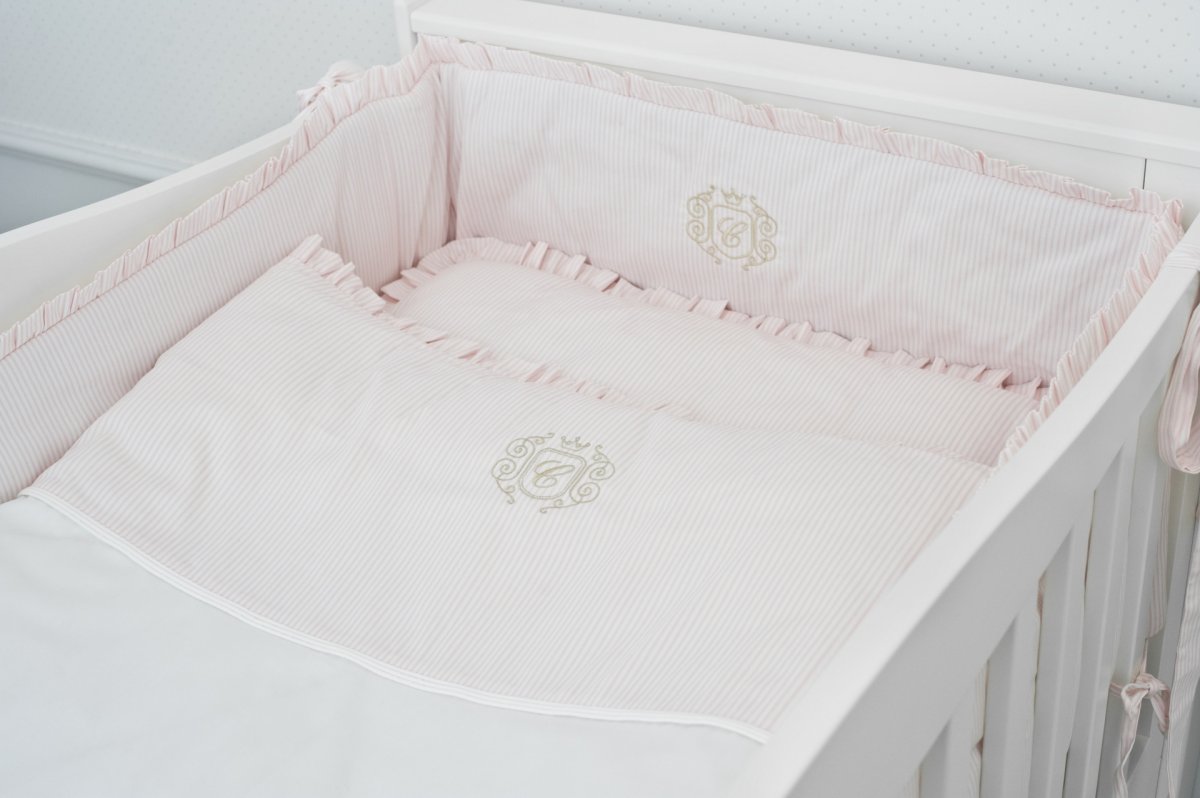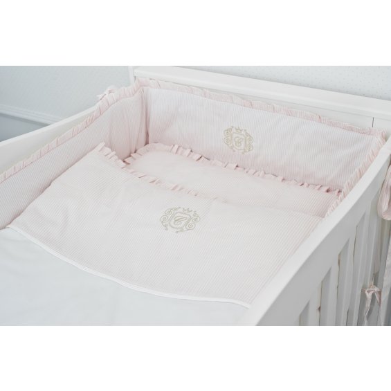 It perfectly fits our elegant bedclothes from luxurious Golden Chic Collection. The bumper is made of high quality fabric with white and powder stripes and decorated with an elegant golden emblem. Thanks to the filling made of a special sponge, the protector is stiff and adheres well to the cot. Short, wide straps allow you to easily mount it to the rung. The cover is fastened with a zip, which allows you to easily remove it, as well as remove the internal sponge. Both products are washable.